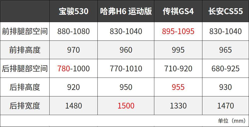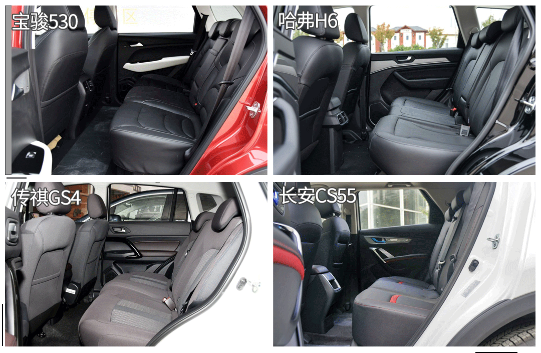 再看4车的空间表现,从实测数据来看,宝骏530在前后排空间上表现是最为均衡的,且后排地台为全平设计,3个人均能找到舒适的坐姿;哈弗H6也很不错,地台平整;而传祺GS4前排很宽敞,但后排比较窄且腿部空间较小,地台有微微隆起;长安CS55在整体空间表现上不如前三款车型,后排隆起较高,会影响中间乘客的舒适感。
