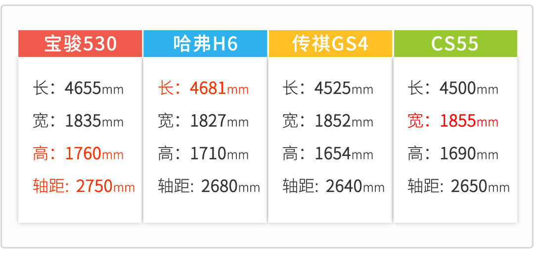 再看车身尺寸方面,宝骏530相较于所有对手,车身高度以及轴距都有一定的优势,长度也仅次于哈弗H6 运动版而已。在这方面而言,宝骏530更懂国人“喜大”的特点。