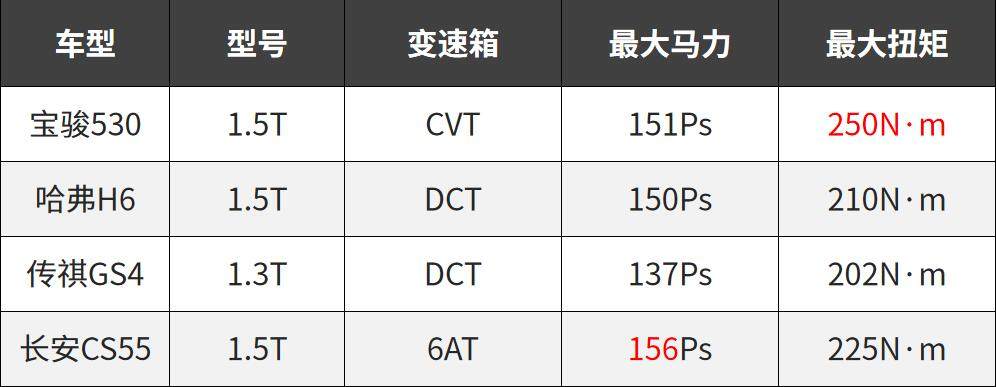 10万出头的预算,除传祺GS4使用1.3T发动机外,其余三车均使用1.5T涡轮增压发动机。动力数值上长安CS55的156匹马力略胜一筹,宝骏530 的151匹马力次之,传祺GS4最弱。而在峰值扭矩上,宝骏530的1.5T达到250牛米的程度远胜其他对手,同时最大扭矩在1600转时便能介入,也就不存在转速低动力输出无力的情况。
