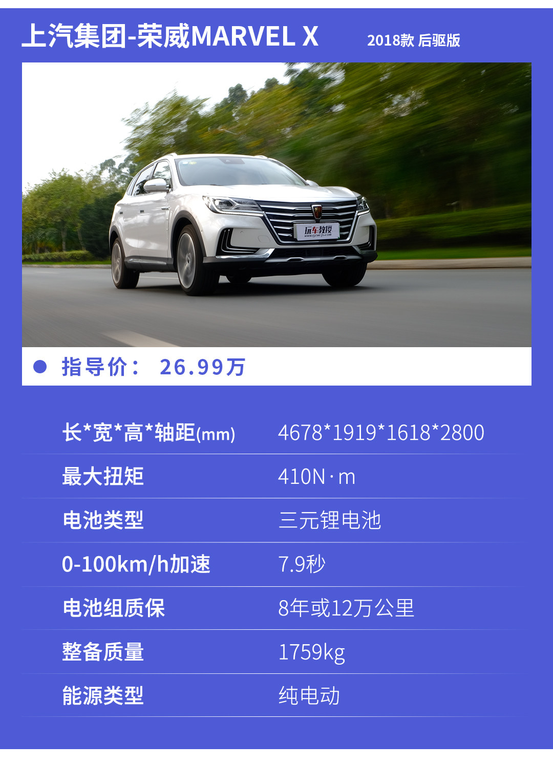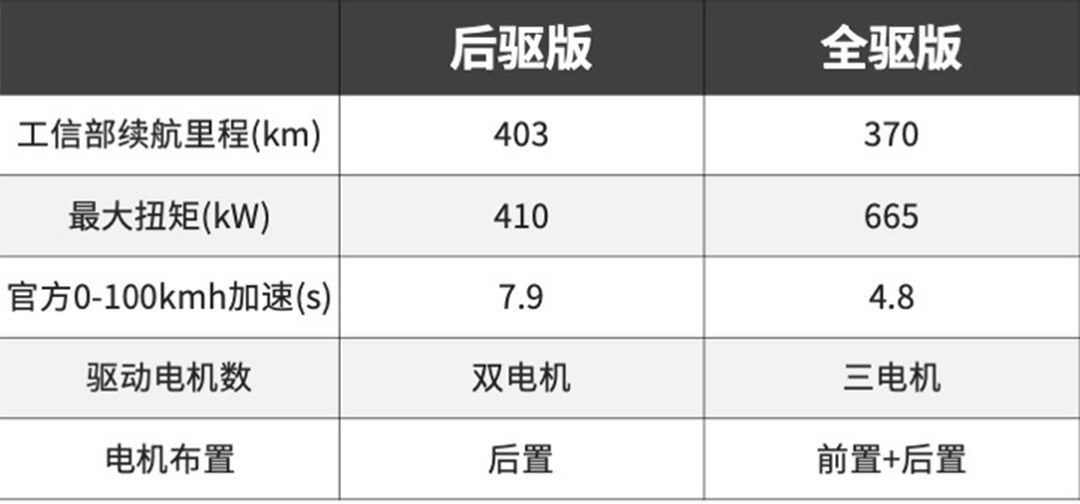 Marvel X目前全系就只有两款车型可选,分别是26.88万的后驱版和30.88万的全驱版,现在教授说的这部是便宜点的后驱版。后驱版比全驱版在前轴少了一个电机,加速时间上会也比全驱版慢上几秒,但因为能耗更低一点,所以后驱版能做到更长的续航里程,其他在配置上与全驱版没有任何区别。工信部给出的续航里程是403公里,但实际使用的话因为受到空调等大功率电器影响会稍减一些,但满足日常通勤问题不大。