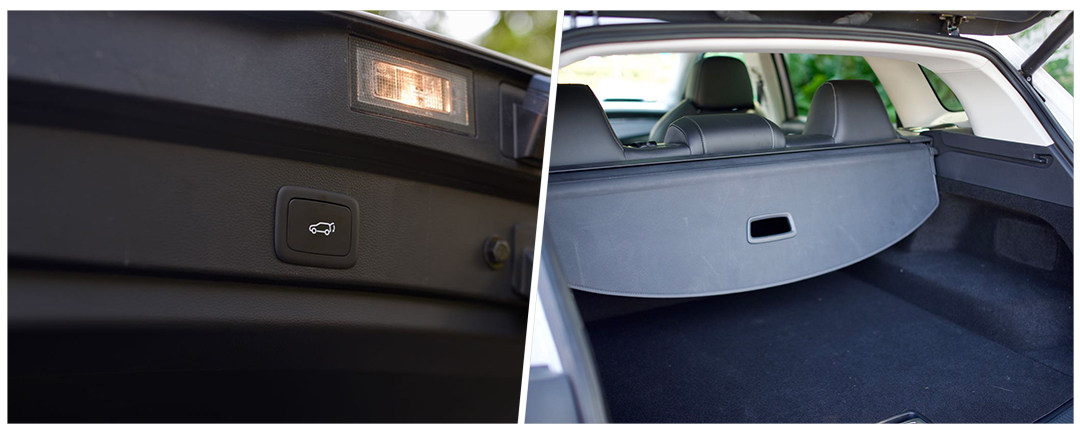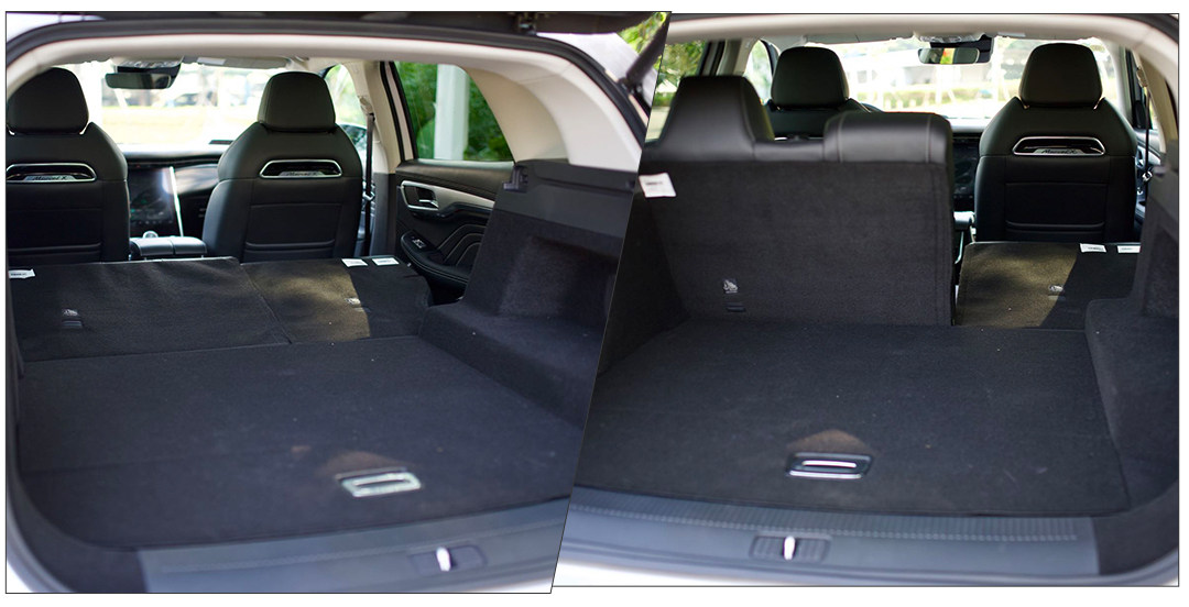 这次教授先从后面开始来,全系标配电动尾门,这是必须的。打开尾门后,可以看到地台比较高,这是正常现象,放3个24寸旅行箱没问题,但高度和剩余空间不会太过充足。不过因为电池和电机都集中在后备箱的缘故,原谅它吧。