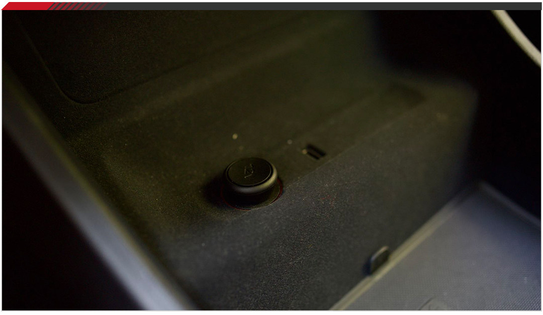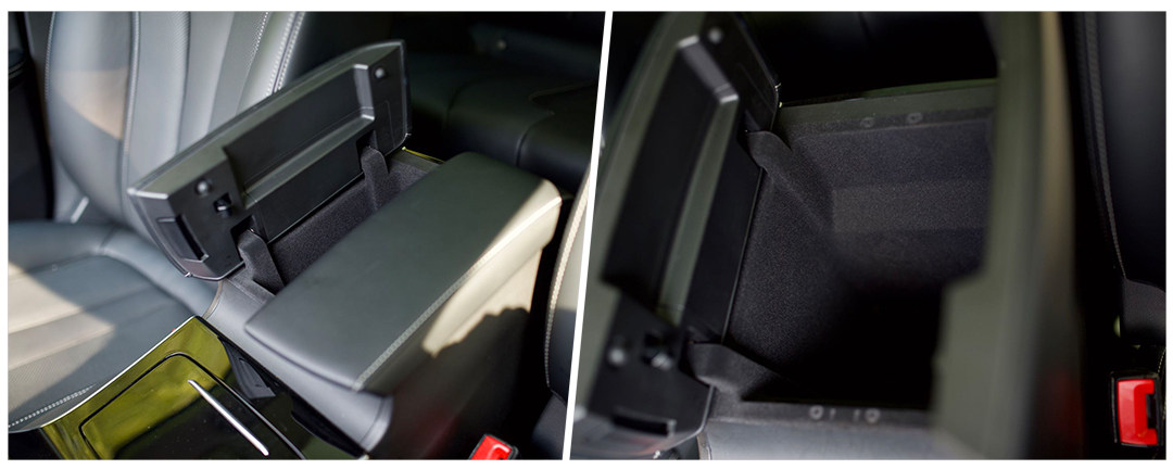 后排中央扶手稍薄,还好用料不错,不会感到不舒适。两个按钮打开后获得两个储物空间,分别能放矿泉水跟手机大小的东西。