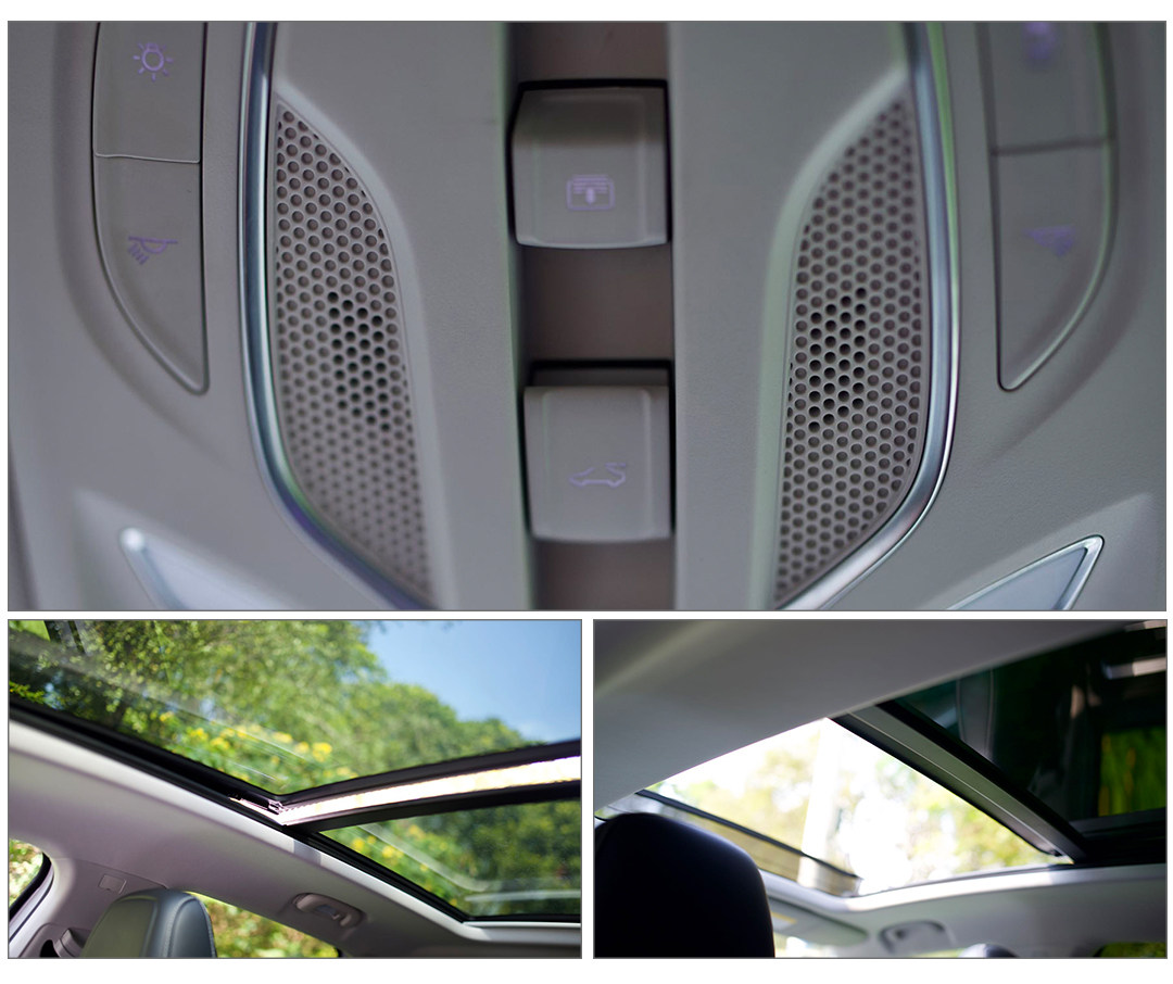 图上面那只不是什么怪兽,只是摄影师拍得像而已,哈哈。中间的两颗按钮对应的是打开天幕与打开天窗,你没看错,Marvel X不是全景天幕,而是真的全景天窗。