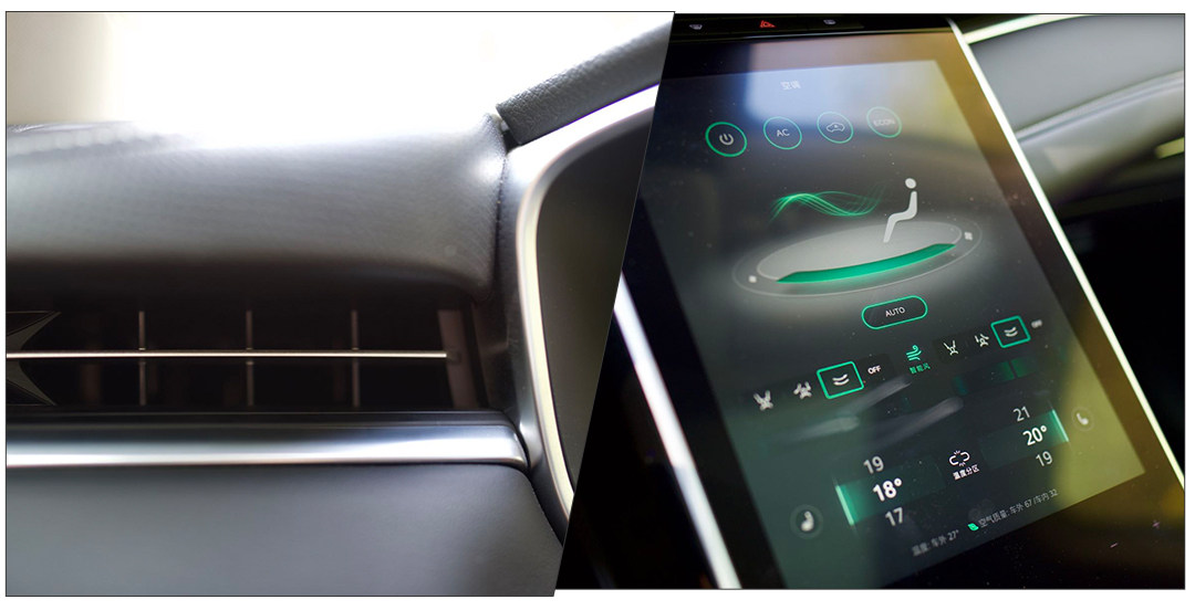 空调出风口的调节叶片没了,毕竟还要手动调是真的老土。空调叶片可以在中控大屏幕中调节,并且有自动左右扫风功能,豪华感一流。