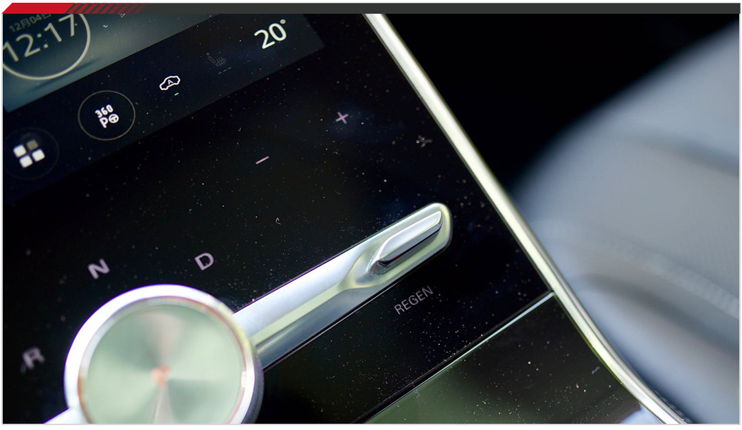 大家记住这个按钮是用来调节动力回收系统强弱的,日常用第二档最舒服实用。上面的一点点都是灰尘,这是所有使用大屏幕都会遇到的问题。