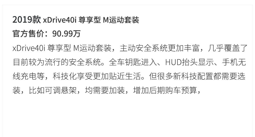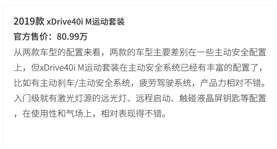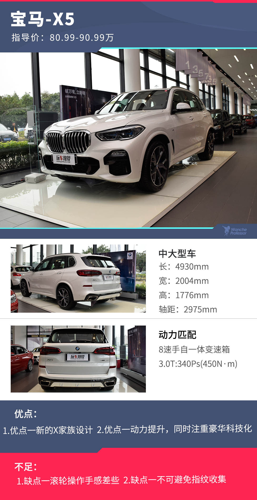 小结:纵向来说,宝马X5作为宝马X家族的开创者,一直是个传承与创新的角色。一方面,无论是品牌自始至终的操控精髓,即使售价接近于百万级别车型的X5,也都没有舍弃;另一方面,X5又努力在科技方面上去予以突破,产品力确实是得到很大的提升。但从横向方面来看,宝马X5的价格,与同级别其他车型,现阶段,似乎没有很高的竞争力。首先,新车亮点,在同级别车型中不同程度上都已经配备,并且主销车型,都几乎是以2.0T动力版本车型为主,在市场上有着可观的市场终端优惠政策 。那么,如果不是纯粹喜欢驾驶操控感和品牌因素,购买宝马X5的消费群体,依然可以选择其他替代产品,在他们看来,其他产品也似乎不错。