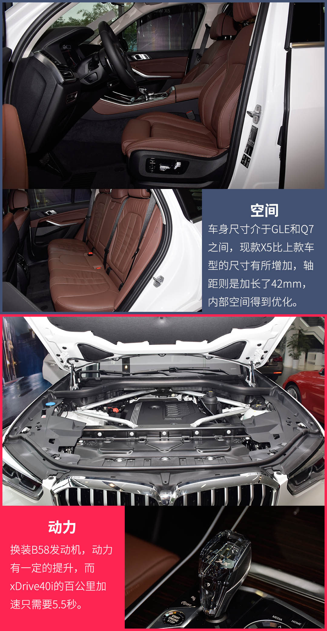 相比于现款车型,由于整车的车身尺寸得到一定的优化,内部空间有一定的提升。但对于一款近百万级别的SUV车型,提升效果并不大。反而,车身结构比例才是重点所在。而在动力上,现款车型搭载了代号为B58的3.0T直列六缸涡轮增压发动机,最大功率为340马力,峰值扭矩则为450牛米,变速箱依然是熟悉的8速Steptronic手自一体变速箱,并且还带换挡拨片。