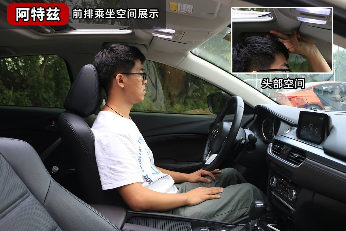 阿特兹的后排空间比想象中好太多了。一掌加三指的后排腿部空间其实只比凯美瑞小一点点,然而头部顶头了。