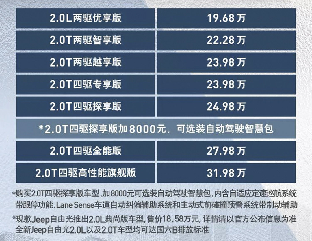 12月10日,Jeep新款自由光正式上市,新车共推出7款车型,售价区间为19.68-31.98万元。全新自由光除了普通版之外,还推出了Trailhawk高性能四驱版。外观上,新车回归到了大众审美,大灯改为了一体式设计,并采用了远近光一体全LED灯组。Trailhawk版的前后保险杠尺寸更加紧凑,以获得更大的接近角和离去角。动力方面,新款自由光2.0L车型的最大功率为108kW(国VI排放车型)和114kW(国V排放车型),2.0T涡轮增压发动机提供高、低功率两款可选,其中高功率版的最大功率195kW,峰值扭矩400Nm。匹配9AT变速箱。里外革新的全新自由光在方方面面都找不到明显短板,无疑又是市场上一款实力之选。