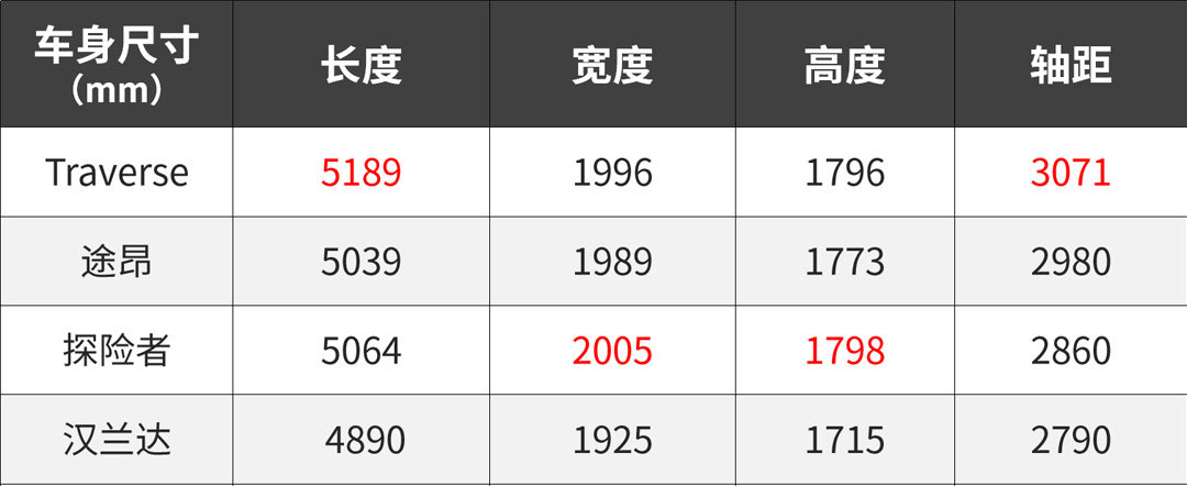 要知道Traverse的车身轴距达到3071mm,比起同级别的福特探险者优势明显,车身宽度也接近2米。