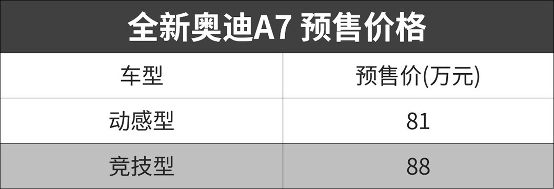 12月12日晚,奥迪全新A7将于北京正式上市,先期将推出3.0T动感型及竞技型,预售价分别为81万及88万。新车的车头看起来相比老款车型更加扁平,更大尺寸以及黑色涂装的六边形前格栅颇具气势。车尾依旧是全新A7的一大亮点,贯穿式OLED尾灯点亮后效果极佳。全新A7内饰沿用了奥迪家族最新的设计风格,多块屏幕的配备使车厢科技感十足。动力方面,先期上市的两款车型将搭载一台3.0T V6发动机,最大功率250kW,峰值扭矩500Nm。此外新车还配备48V微混系统,燃油经济性将进一步提升,匹配7速双离合变速器。A7一向被誉为最美奥迪轿跑车,此次也没有让人失望,最终上市价格有没有惊喜?今晚见分晓。