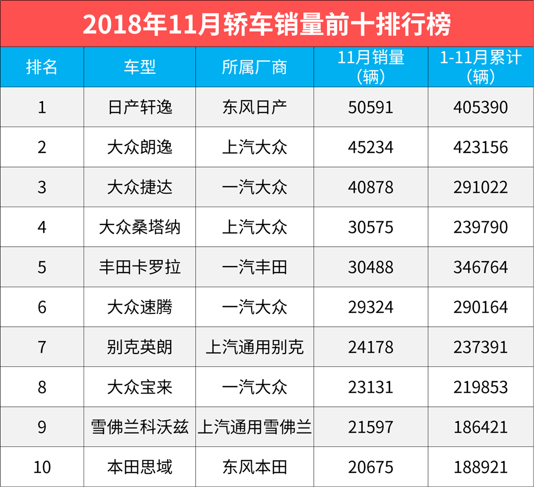 虽然车市遭遇正经历着一场前所未见的“寒冬”,但在11月的轿车内部市场中可谓热闹非凡,在身后苦苦追赶朗逸的轩逸终于又在11月再次夺回冠军宝座;包揽榜眼、探花、进士共5款车型上榜的大众依然是轿车市场中的最大赢家;而继9月后国产轿车再次无缘前十榜单,11月的轿车销量前十榜单可谓看点多多。