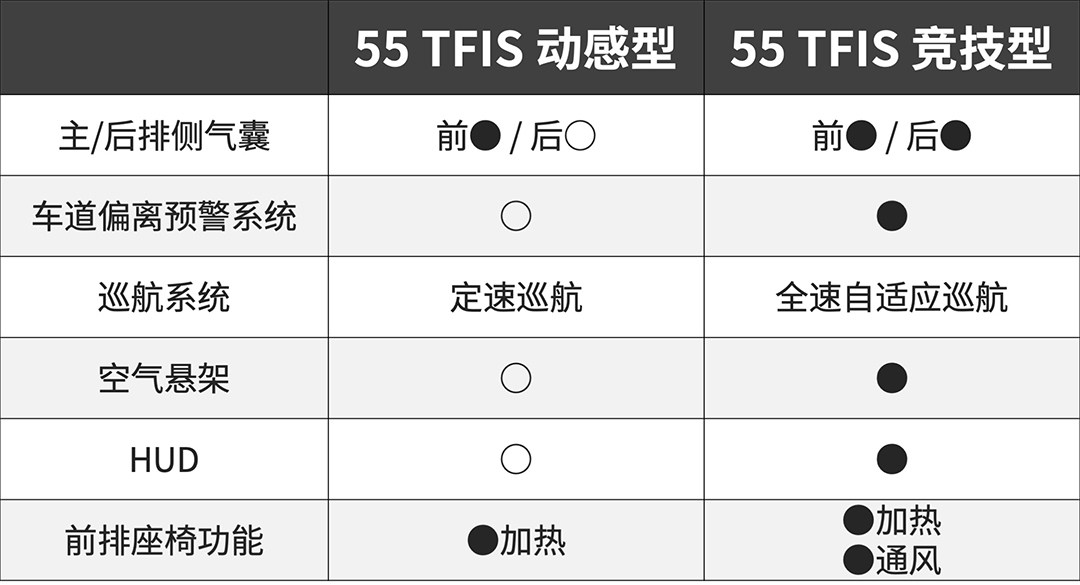 配置方面A7两款车型更多的差异主要在于配置的高低,教授更推荐55 TFSI竞技型,虽然它比55 TFSI动感型高出7.1万元,但在配置上却多出不止这个价格的豪华实用配置。类似全速自适应巡航、可变空气悬架、HUD、座椅通风等,这些都是后期加装非常难或者价格比较高的配置。