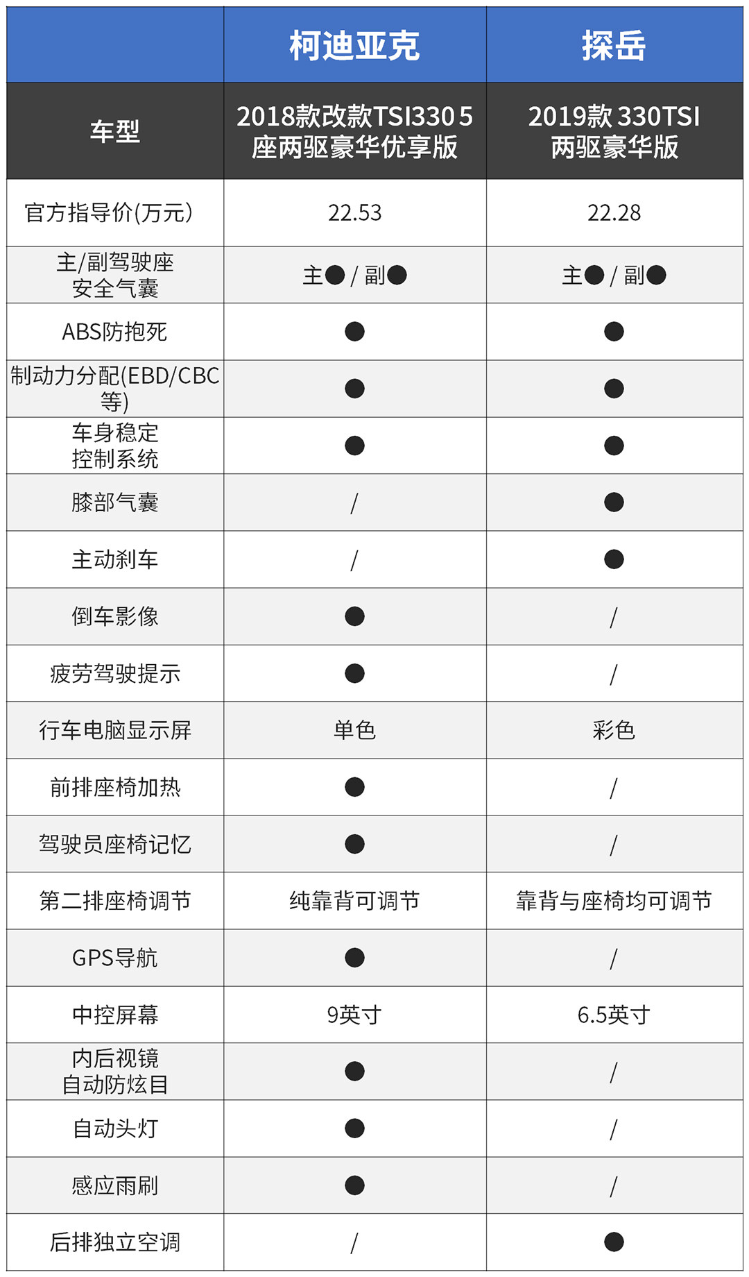 从上表中,不难发现,两者对比下柯迪亚克的配置明显要丰富很多,像什么倒车影像、前排座椅加热等功能都能在其身上找到,配置的增加也使得柯迪亚克在日常用车的舒适性、便利性上要比探岳略微有优势。不过,细看之下,探岳配置虽说略显寒酸,对比柯迪亚克也完全是呈被碾压趋势,但满足日常用车它基本还是没什么问题。