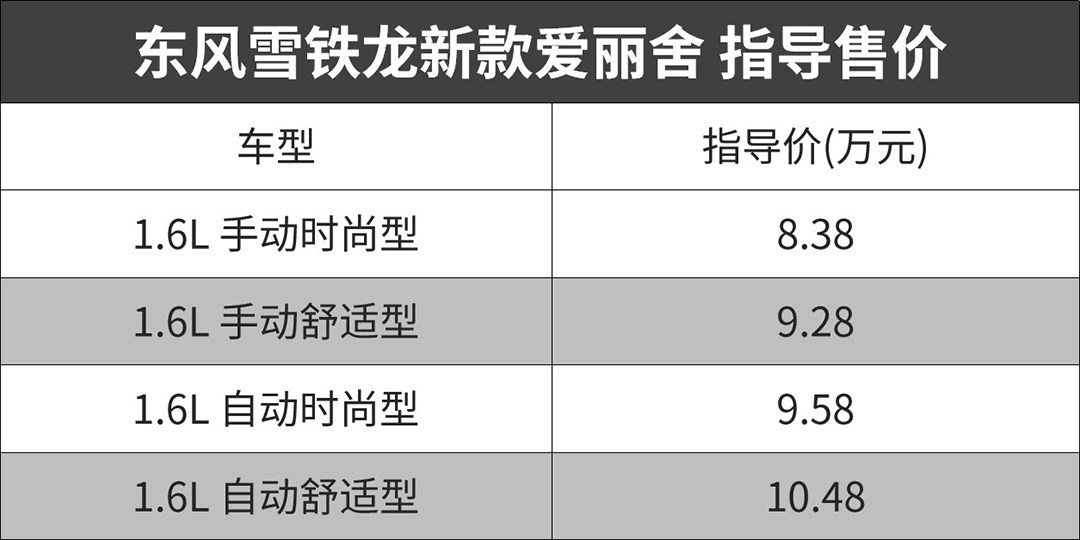 日前从官方获悉,东风雪铁龙新款爱丽舍正式上市,共推出4款车型,售价为8.38-10.48万元。由于是年款车型,新车在外观内饰上并没有太大变化。配置方面,新车全系取消驾驶员车窗一键升降,时尚版可选装电动天窗,同时取消后视镜电动调节、后排座椅比例放倒。动力方面,新款爱丽舍仍搭载老款车型所使用的1.6L自然吸气发动机,其最大功率为117马力,峰值扭矩为150牛·米。传动系统方面,与发动机匹配的同样是5速手动或6速手自一体变速箱。爱丽舍是国人心中的经典车型,此次调整配置上市,相信会进一步增强其竞争力。
