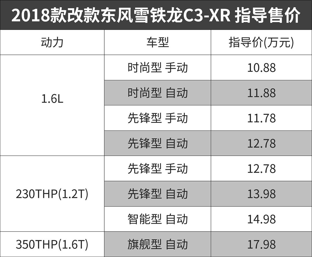 日前从官方了解到,2018款改款东风雪铁龙C3-XR于12月14日正式上市销售,新车共推出三种动力8款车型,售价为10.88-17.18万。新车外观内饰与现款车型基本保持一致。对配置部分进行了微调,例如取消了低配车型前保险杠下方的镀铬饰条、低配车型的铝制轮圈改为钢圈、全系车型仪表盘刻度从3D样式改为了2D以及更换了部分内饰面料等。动力方面,新车将继续搭载1.6L自然吸气、1.2T以及1.6T等三款发动机,最大功率分别为117马力、136马力和167马力,并搭配5速手动和6速手自一体变速箱。此次优化配置上市将进一步增强该车型的整体市场竞争力。