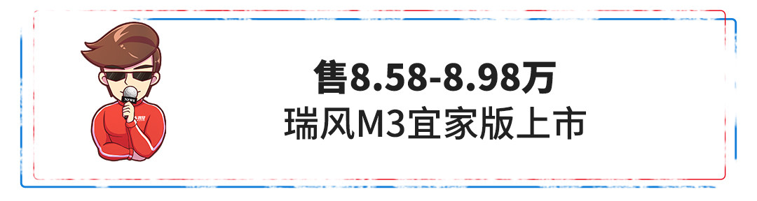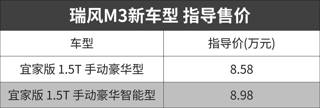 日前江淮汽车获悉,瑞风M3宜家版1.5T车型正式上市,售价区间为8.58-8.98万元。2019款瑞风M3已于11月14日上市,不过当时1.5T动力车型并未同步推出。此次上市的宜家版1.5T车型在配置上与宜家版1.6L车型基本一致,仅座椅翻折形式略有区别,并且1.5T手动豪华智能版还进一步增加了定速巡航功能。动力方面,新车搭载4A91T型1.5T发动机,最大功率147马力,峰值扭矩210牛·米,传动系统匹配5速手动变速箱。作为商用车,瑞风M3在国内有着不错的用户基础,新车型的推出将进一步丰富消费者选择。