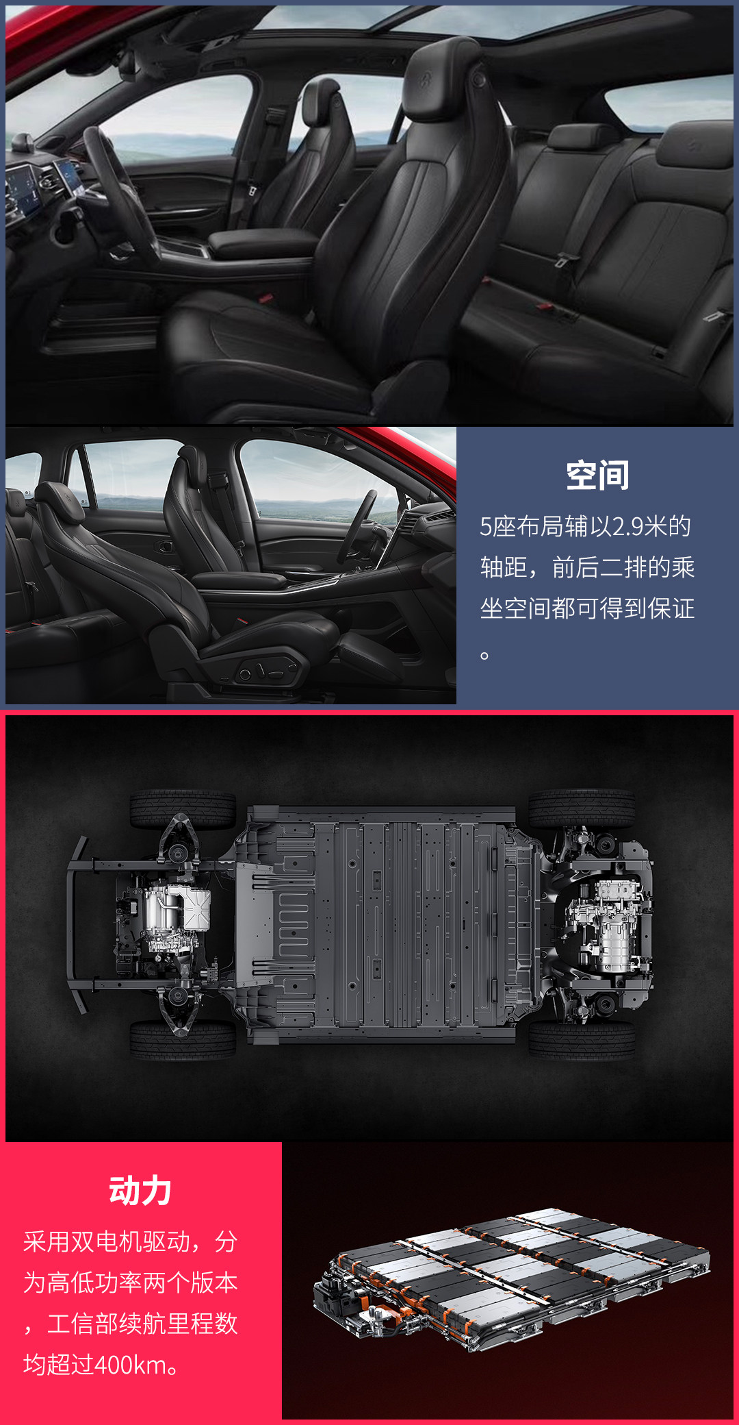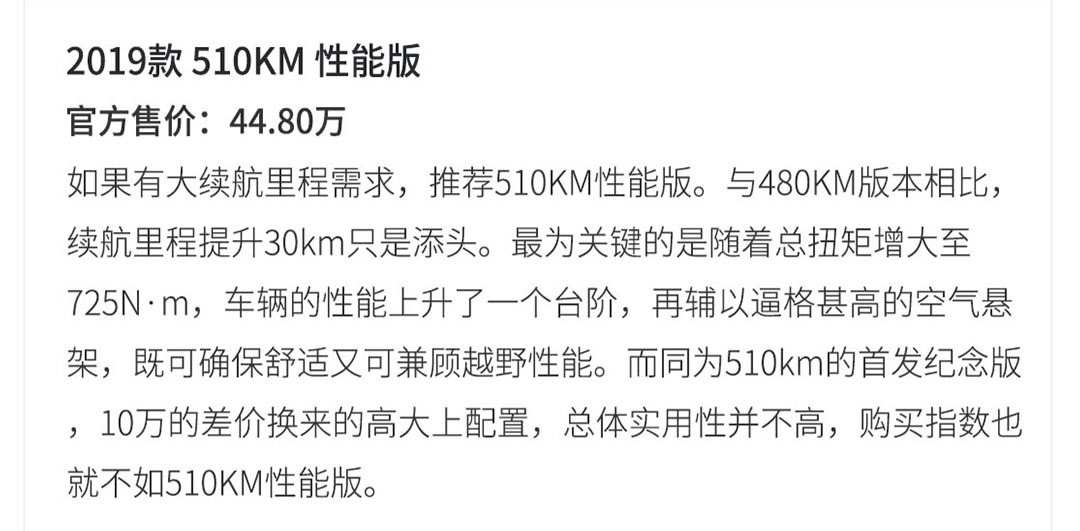 新车采用前后双电机的纯电动驱动模式。可细分为高低功率两个版本,低功版总扭矩为610N·m,百公里加速时间为5.6秒;高功版总扭矩为725N·m百公里加速仅需4.7秒。电池容量分别为70和84kWh,NEDC工况下有410、430、480、510km四种续航里程数。两种电池容量都可提供快慢两种充电方式,低容量电池快充0.8小时可充80%的电量,慢充10小时可充满。而高容量电池同样是快充0.8小时可充80%的电量,慢充则需要12小时才能充满。