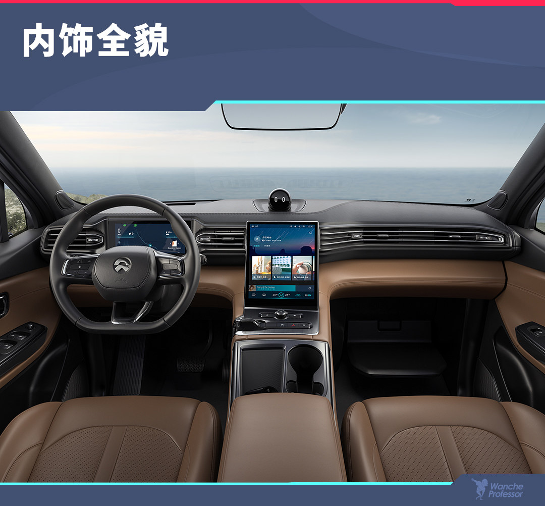如果说在外观层面ES6还愿意花点心思,那么到了内饰就开始“偷懒”了,选择直接照搬ES8的做法,幸好只是家族第二款产品并且观感足够惊艳所以不会令人有任何生厌之感。以特斯拉为首的中控巨屏简约科技风内饰成为新能源车型乃至部分传统燃油车争相学习的对象,而蔚来在此基础之上通过中控台上方的NOMI助手强化了科技属性,并利用黑棕的双色配色和大量Nappa真皮补足了特斯拉所缺少的豪华质感。而一体式的座椅和三幅式平底方向盘的出现说明ES6始终不忘自身运动的属性。