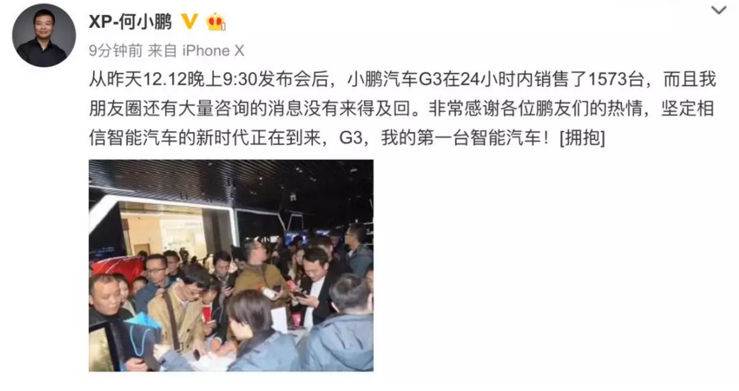 接下来,在12月12日晚9点30价格公布后,小鹏G3在24小时内就销售了1573台。