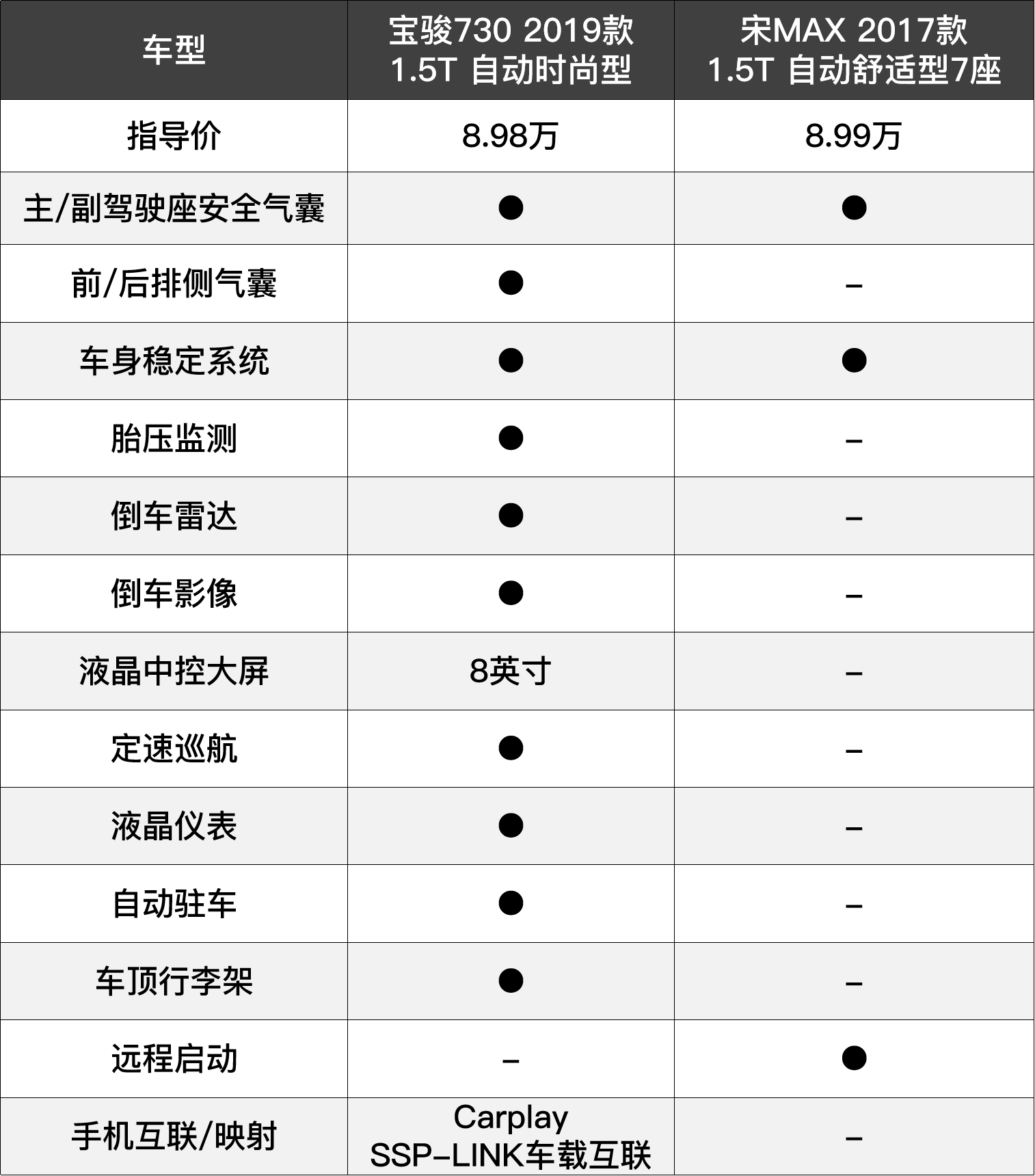 其次,宝骏730自动挡车型的安全和科技配置更出色,性价比高。以比亚迪宋max自动挡车型为例,虽然两车售价差不多,但在科技配置和安全配置方面,宝骏730自动挡车型可以说碾压了对手。