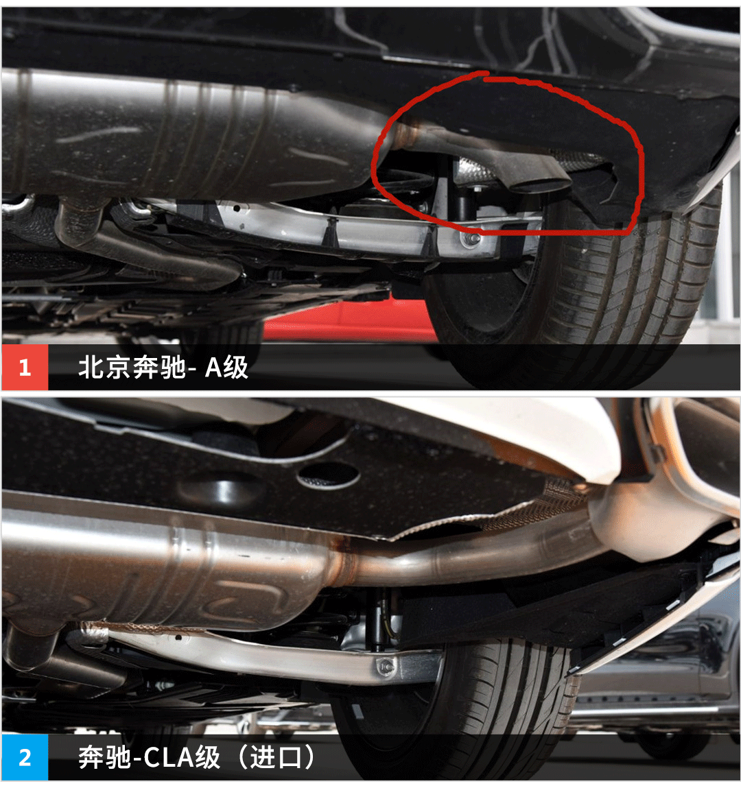 此外,教授还要告诉大家一个两款车之间不容易察觉的差别。那就是两款车虽然表面上看都是双边双出的外露式排气口,但新A级的镀铬排气口只是装饰,真正只有一个隐藏式的单边单出排气口(上图红圈处)冬天排气管冒烟,被别人识破的时候就会很尴尬。而CLA级两边都是真的排气口,冬天不怕露馅。在这点上,新A级就不厚道了,奔驰作为一个豪华品牌,难道就真的这么在乎一段钢管这么点成本吗?如果在乎,那为什么要对不同车型区别对待?