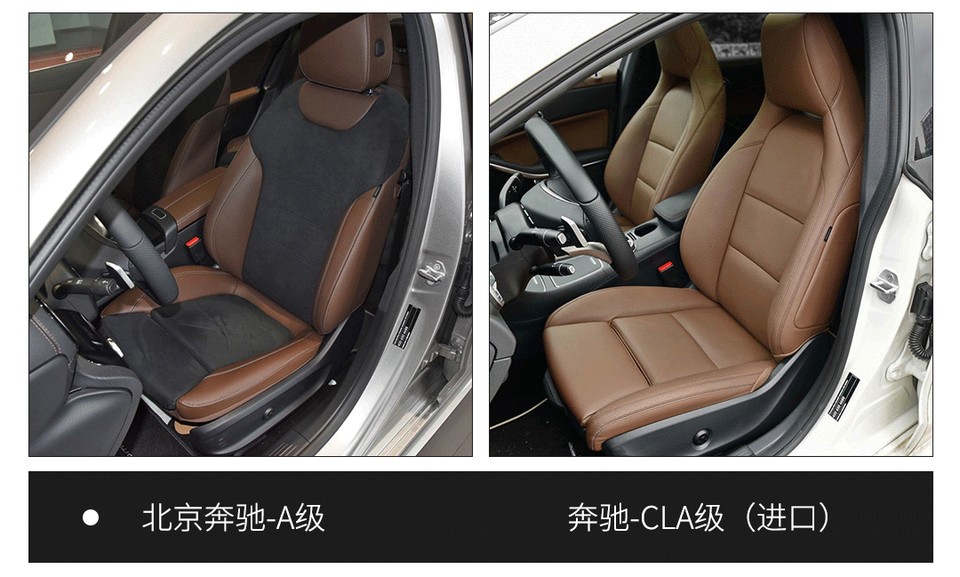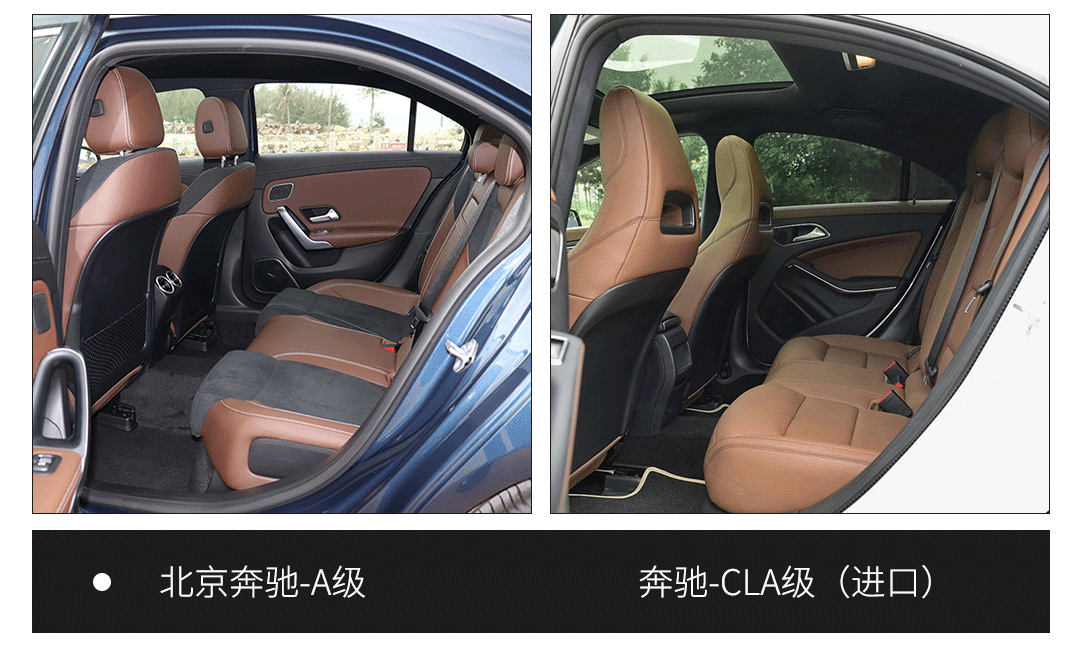 前排空间二者相差不多,但新A级得益于更大的车身高度,头部表现稍好。此外,新A级只是普通样式的座椅,而CLA级作为轿跑,采用头枕与靠背一体式的运动座椅设计。