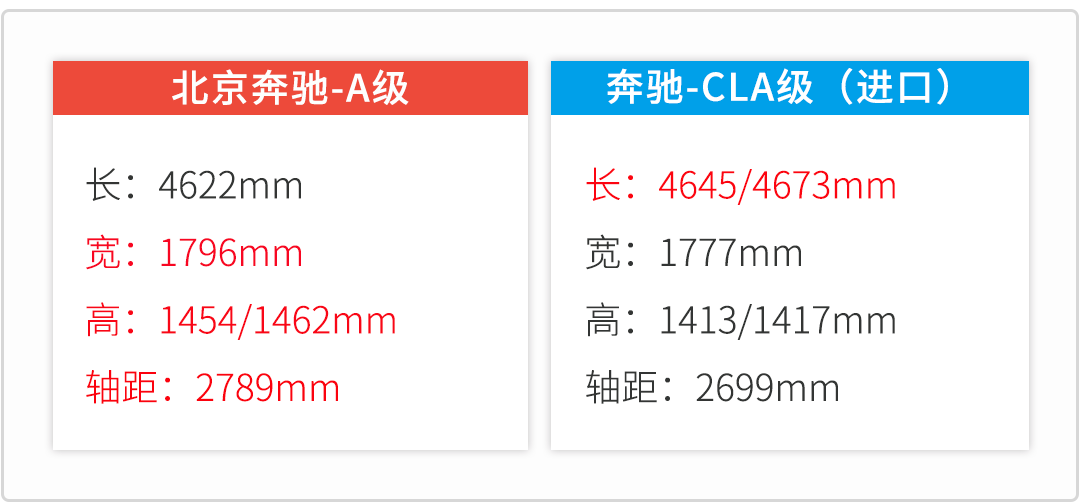 看完主观视觉感受,再来看看客观数据,新A级除了在长度上不如CLA级,在宽度、高度、轴距都全面领先,这也告诉了我们为什么CLA级更加像一辆轿跑,因为无论是主观感受还是客观数据,它都更加低矮而修长。而新A级更多是一辆照顾日常实用性和空间感的紧凑型轿车,至于那种设计更好看,就见仁见智了。