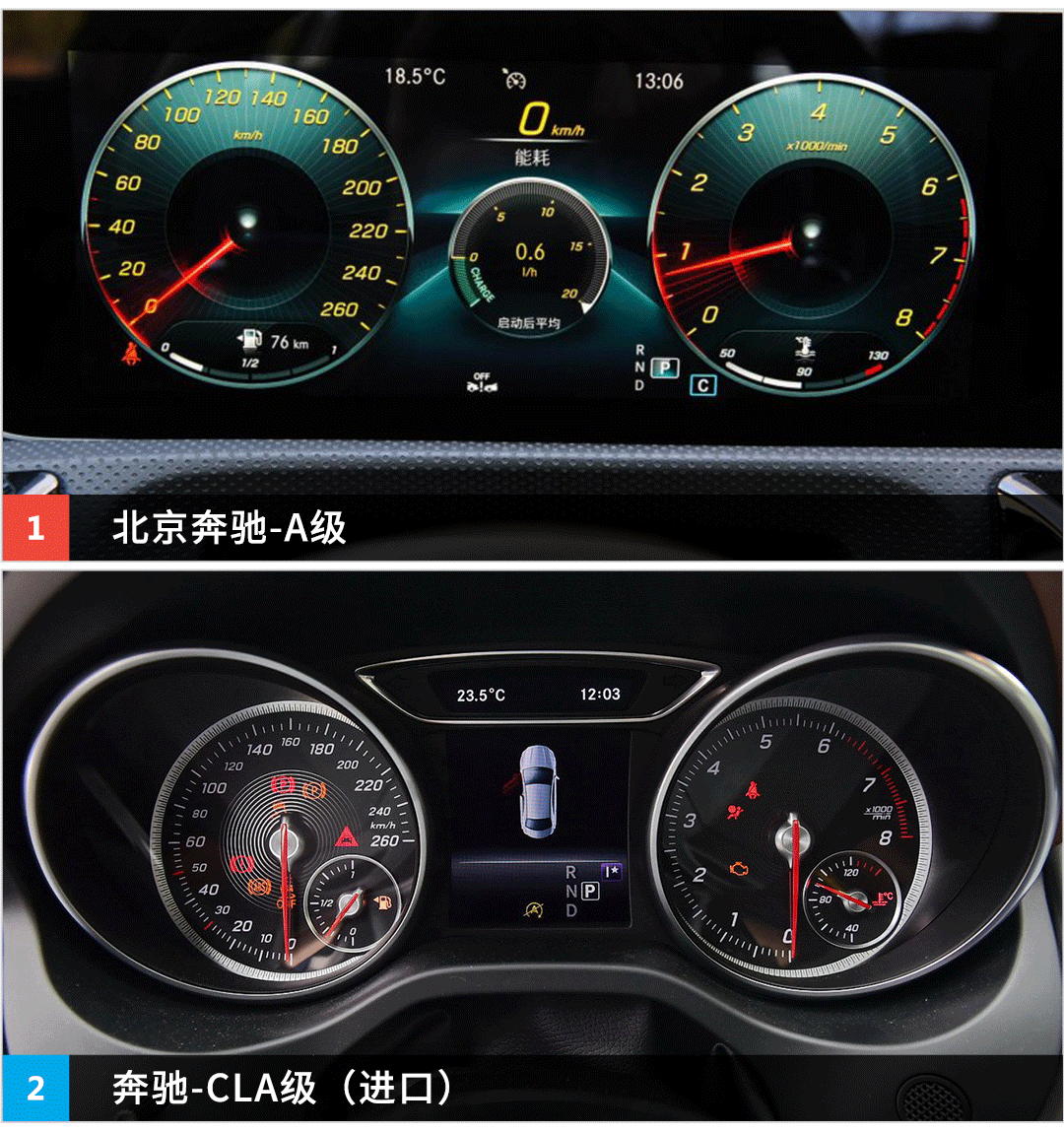 内饰上,两款车明显是不同时代的作品。新A级采用了最新款式的方向盘和连通式的全液晶仪表盘和中控屏,并且中控台的实体按键只保留了空调等这些常用的功能,其它都集成到了车载系统中,显得非常豪华和有科技感。而CLA级依然采用老款方向盘、机械仪表、像是汽配城后加的悬浮中控屏,还有布满各种密密麻麻按钮的中控台,档次感和科技感都明显落伍了。