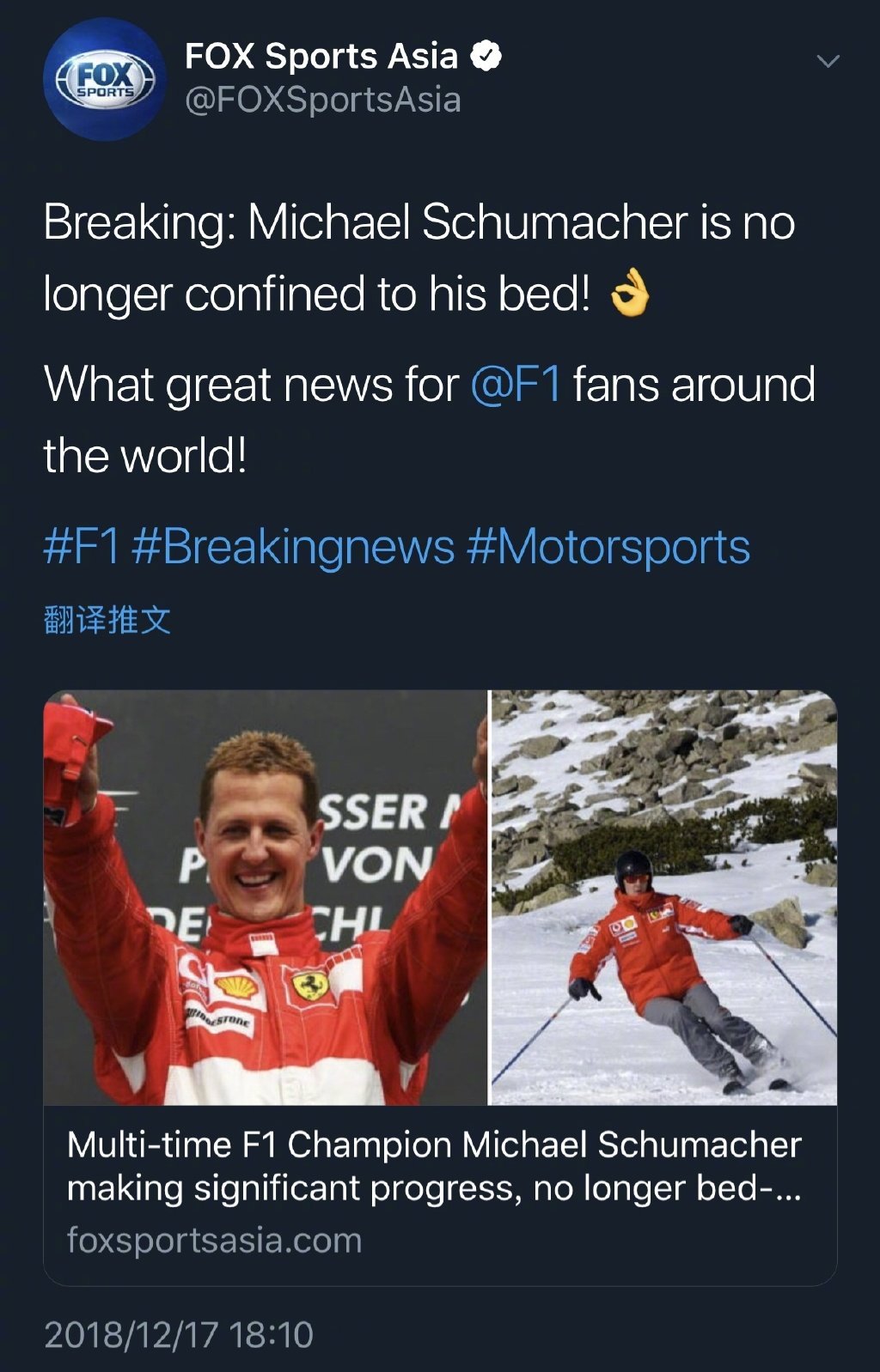 根据海外媒体的消息,五年前遭遇滑雪事故的“F1车王”舒马赫终于迎来苏醒,现在已经不需要插管维持生命,但仍旧需要接受护理和治疗。迈克尔-舒马赫(Michael Schumacher),德国人,一级方程式赛车传奇车手,此前总共获得7次总冠军。2013年时在法国阿尔卑斯山滑雪发生事故,头部受到岩石的撞击而严重受创,自此开始了长达数年的艰难的治疗。对于所有关心汽车赛事竞技的车迷而言,看到昔日的王者总算恢复一定的健康莫过于最大的安慰,在此也祝愿舒马赫早日康复!