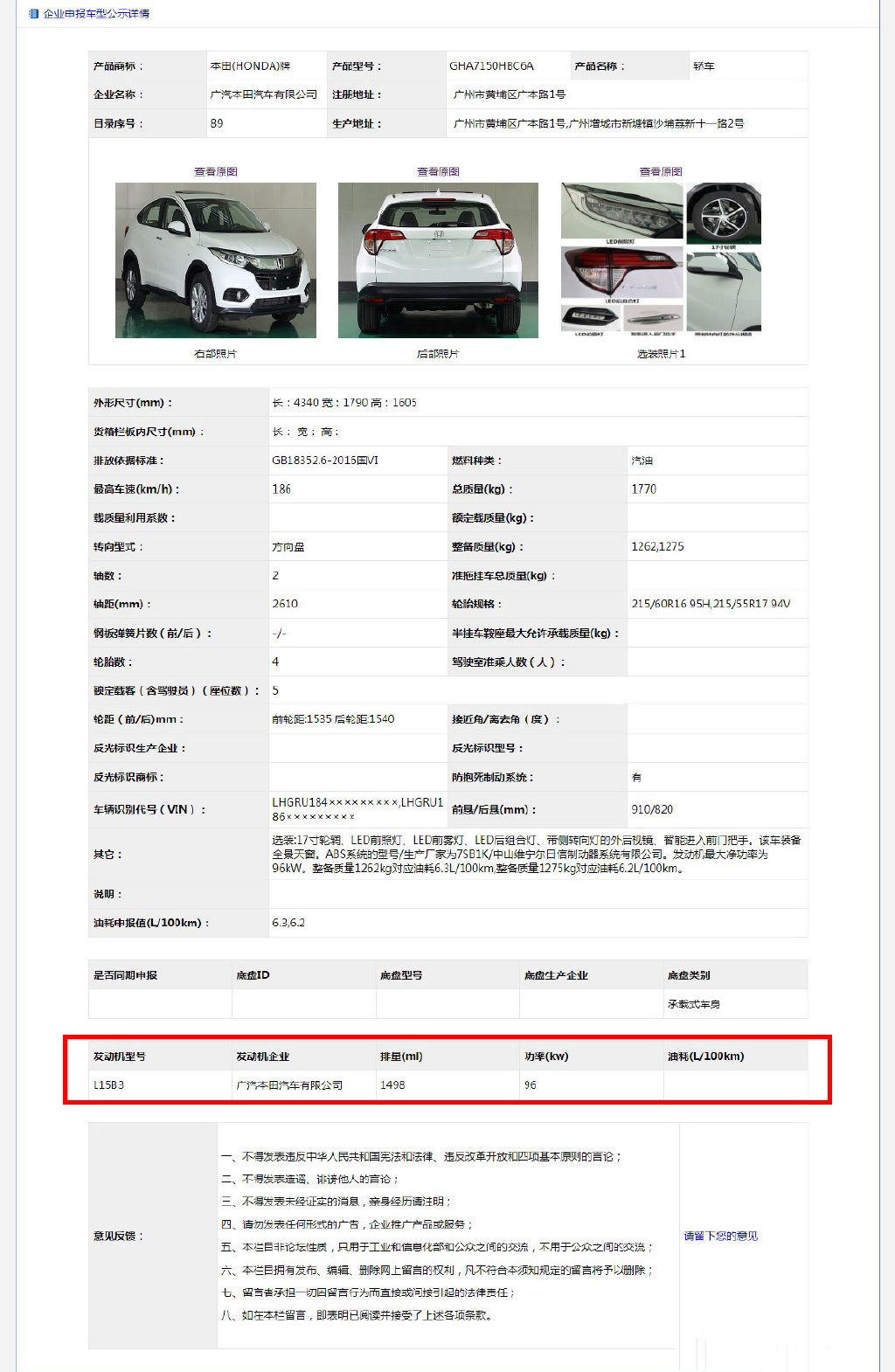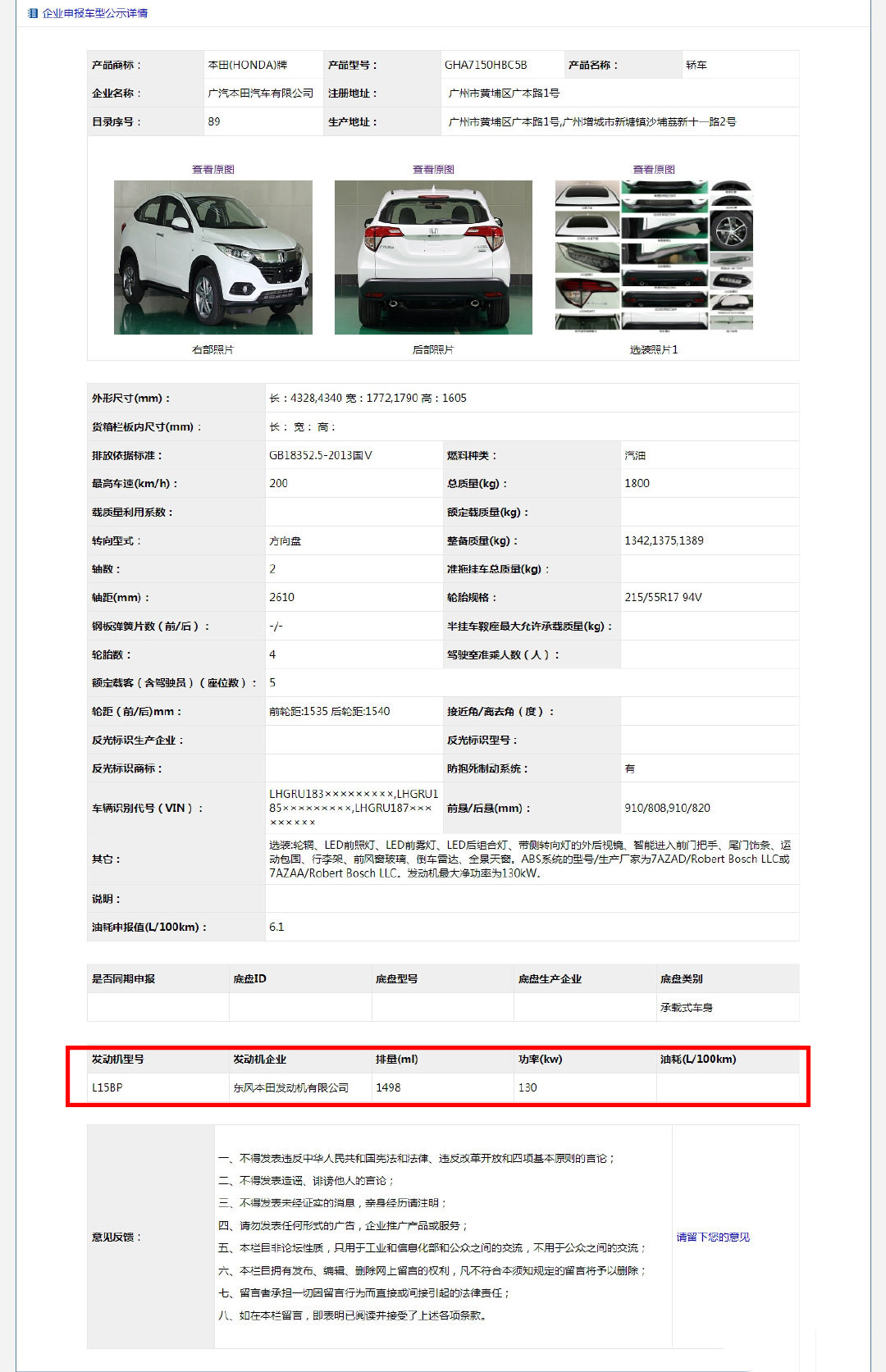 近日,在相关渠道获悉,工信部已经有一组新款#本田缤智#的申报图,外观大体没怎么变的情况下,中网那一根硕大的镀铬装饰条分外抢眼,不过这也是延续了本田的家族式设计风格。但值得注意的是,新款的缤智疑似会换装1.5T的涡轮增压发动机,在两张同属于缤智的申报信息表格中,其中有一张显示发动机型号为“L15BP”,最大功率为130kW;该功率值与现款思域1.5T版本持平,同时也与之前已经上市且以高动力为卖点的小型SUV:现代昂希诺的动力参数处于同一水平线,作为有着性能光环的品牌,本田总算要对自家的小型SUV动手,一举打造一辆属于自己的小钢炮SUV了?