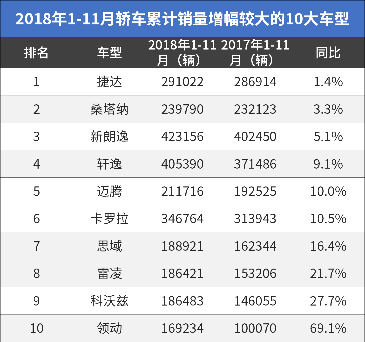 11月份的轿车销量数据早已经公布,可以看出整体车市还是不如意。都说今年车市低迷,但这些车型却很滋润。如果说单月份的销量增幅有很大变动的话,那么,前十一个月累计销量情况就很有参考价值了。在前十一个月累计销量同比增幅中,这十款轿车凭借着自己的硬实力,在众多车型中脱颖而出。