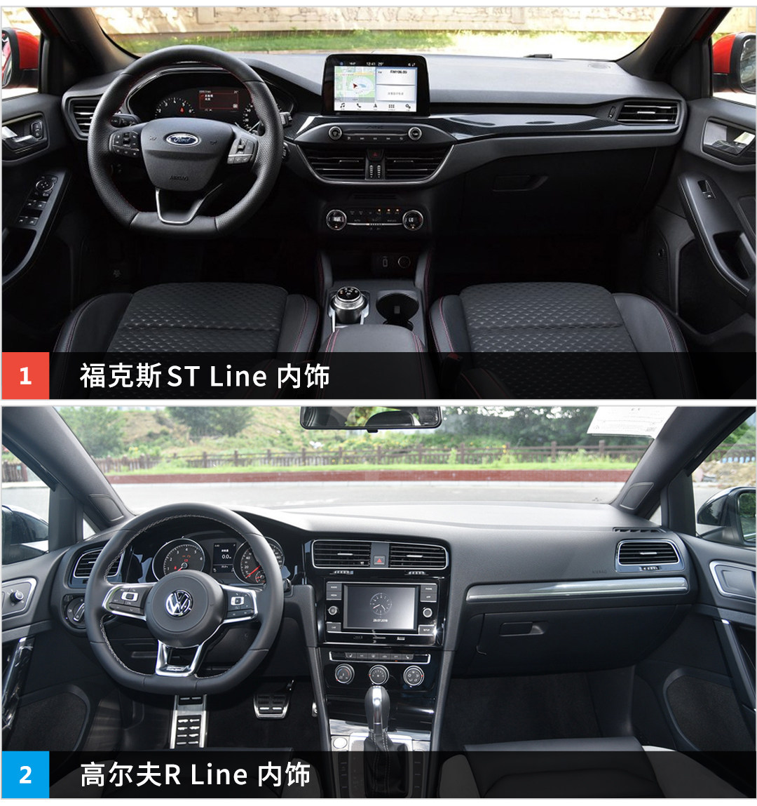 另外,福克斯ST Line和高尔夫R-Line的内饰也有专属的设计,比如专属的标识或运动座椅,又比如福克斯ST Line的红色缝线,或高尔夫R-Line的翻毛皮拼接座椅等。