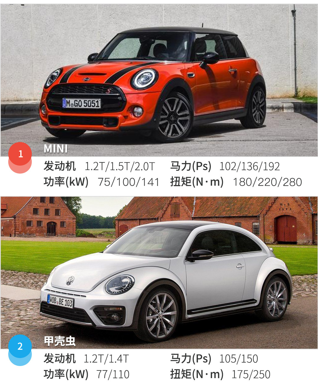 MINI旗下有3门4座版、5门5座版、还有2门4座敞篷版等多种车型,丰富得有些眼花缭乱;而甲壳虫就相对比较简单些,主要分为普通、敞篷和越野三种版本,其中,两款车型都有两门敞篷版,而且拉风实用性都还可以。不过,细分之下,MINI可供消费者选择的购车范围以及实用性都要更好些,其实吧,教授觉得也不足为奇,毕竟人家MINI还有个五门版的车型在坐镇呢。