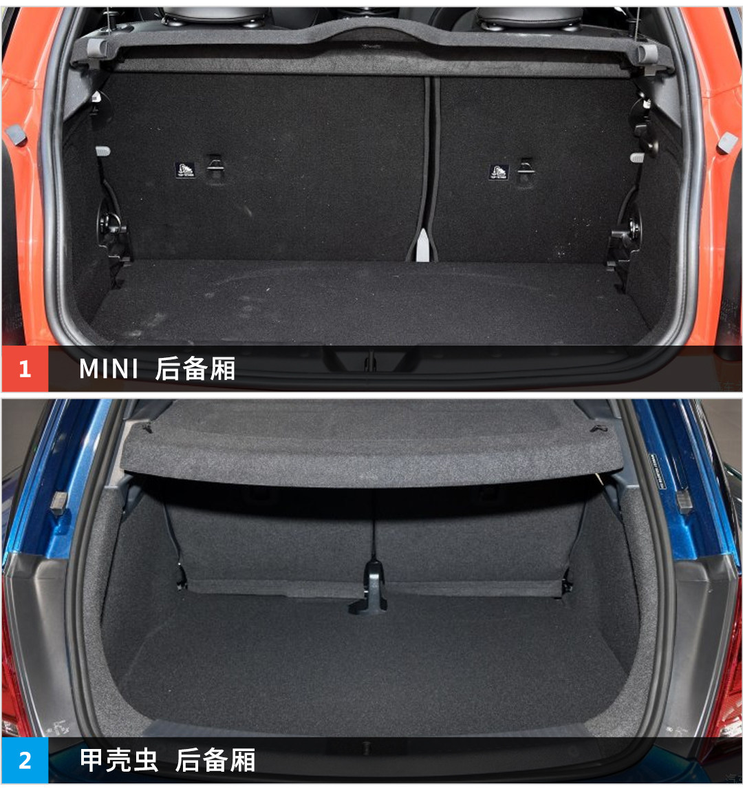 在价位基本相同的情况下,两者的配置都差不多,都是1.2T的情况下,两者都没有倒车影像,不过MINI多了个多功能方向盘和前倒车雷达,而甲壳虫则是氙气大灯,但总的来说,要想满足日常的用车需求,两者基本上还是能做得到的。