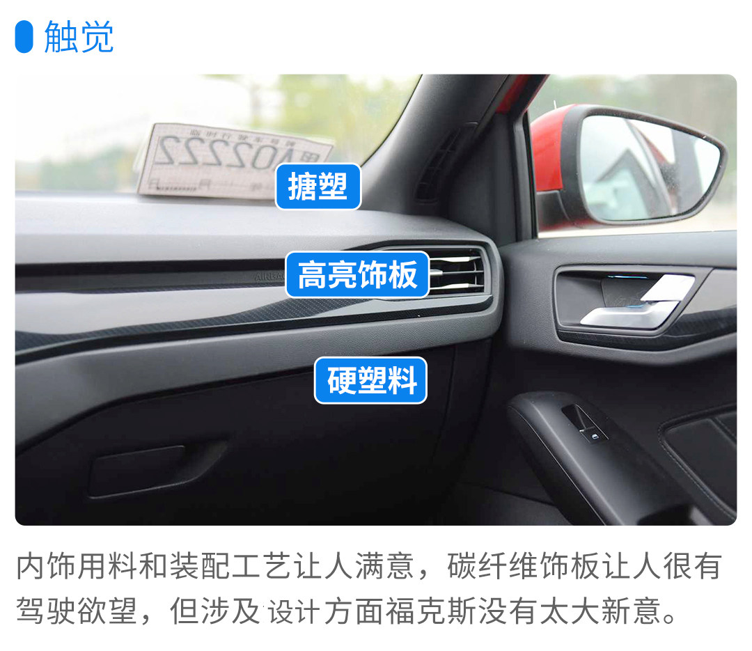 对于福睿斯这个价位的车型来说,中控顶部使用了软搪塑是我没有想到的,在入门级紧凑型轿车中并不多见,福特的用料水平还是值得肯定的,而且那两道缝线看上去也非常逼真。车内的内饰氛围比同价位其它车型好一些。到了福克斯身上,内饰则是新一代福特车型的风格,更加平直简洁的设计、更合理的人机工程学使得福克斯比起旧款车型更加科学、视觉上也觉得更加宽敞。相比较福睿斯,福克斯则是一种运动化的风格,整车的内饰氛围足够年轻,不过唯一的问题就在于方向盘造型有些平庸了,相比较这个内外设计来说有些不搭。