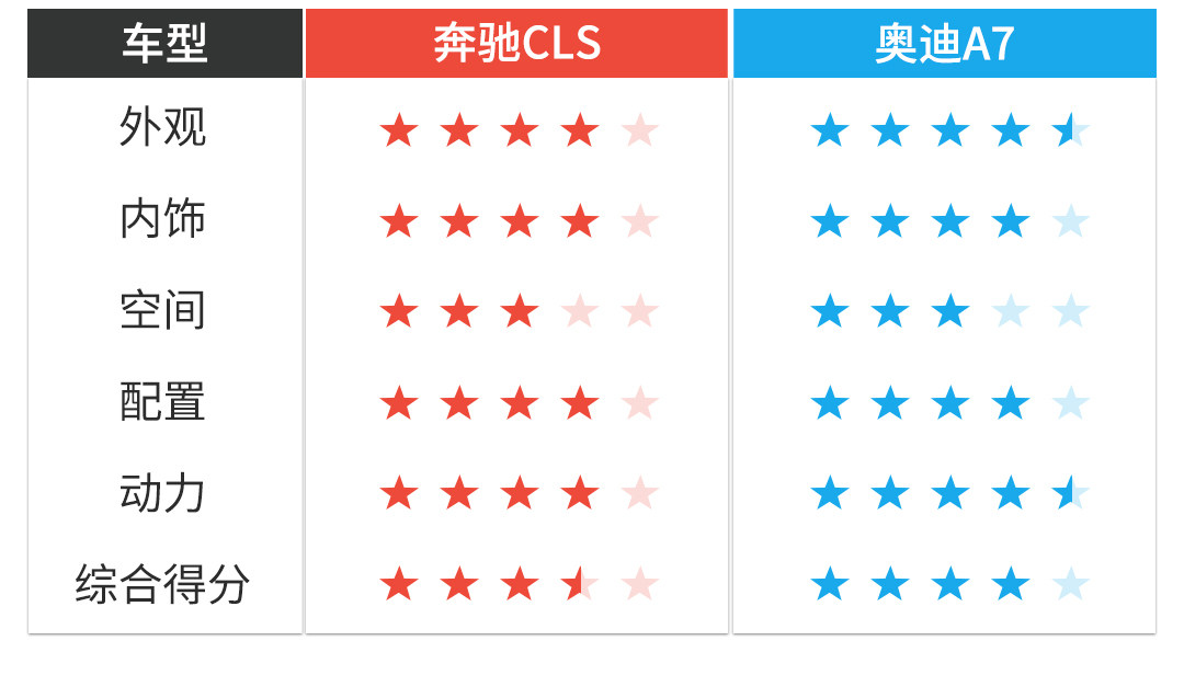 虽然说奥迪A7还未在国内上市2.0T车型,但是奔驰CLS应该就不会引进3.0T车型了。目前两车的动力水平不同,参数不同,实际驾驶风格也是不同的。虽然奔驰CLS是2.0T,但是动力也十分充沛,整体调校不急不躁,运动和舒适拿捏得很好,给人一种优雅,高级的驾驶体验。而奥迪A7无论是动力储备,输出平顺性,静谧性,都十分均衡,而且都是极度出色的表现,同样可以把舒适和运动拿捏得很好,或许这就是轿跑车型该有的驾驶体验吧。