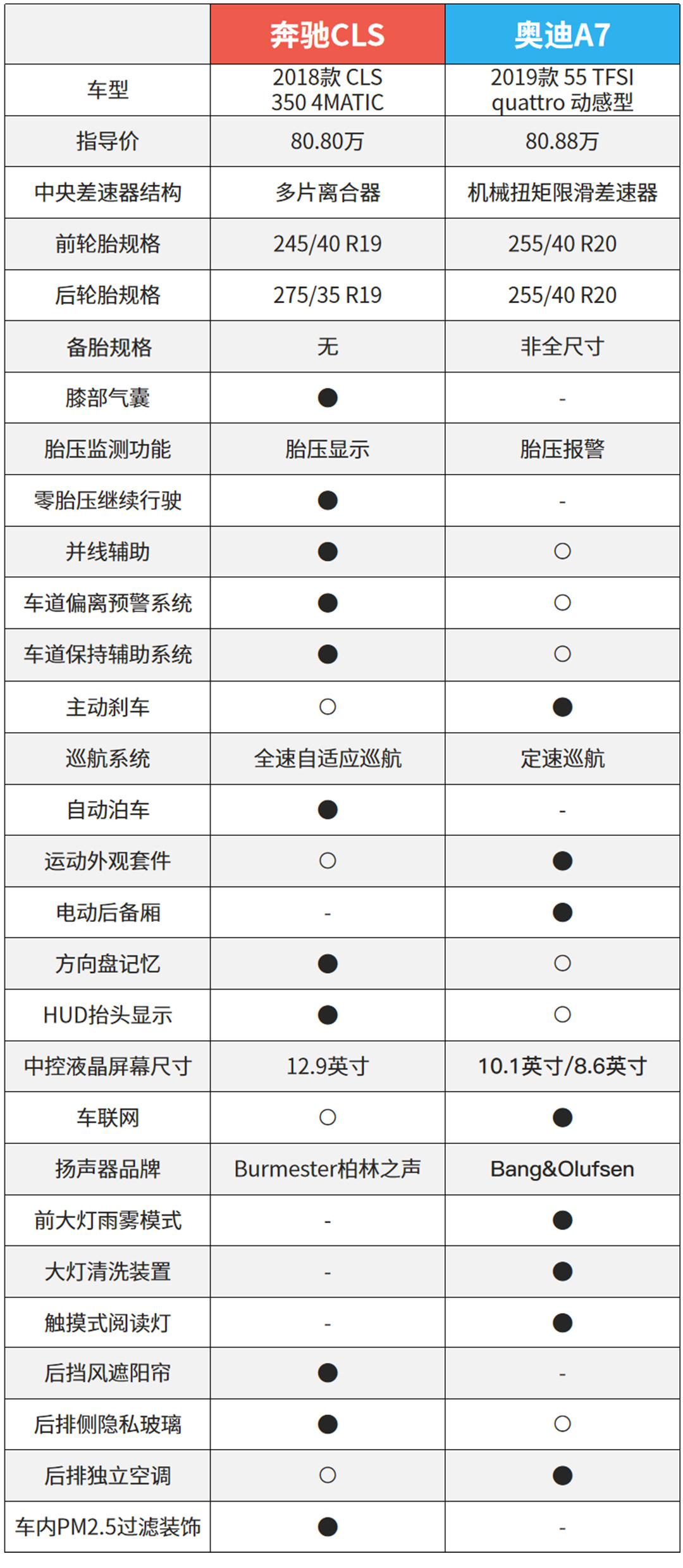 配置方面,我们通过选取两款同价位的车型做配置的差异对比,可见两车的配置都非常到位,毕竟两车落地都得近百万。综合来说,两车的配置水平不分上下,只是奔驰CLS的安全配置会更全面一点,而奥迪的灯光配置则更有优势,毕竟“灯厂”的头衔还在。但是,目前奔驰CLS全新车型都是有较大的优惠幅度,而奥迪A7上市不久,暂无优惠消息。另外,除了配置,2.0T和3.0T当然也是两款车型的差距之一。