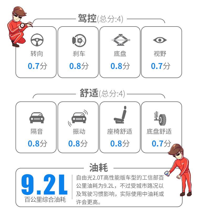 2019款自由光全新加入的2.0T发动机动力充沛,265匹马力以及最高400牛·米的扭矩足以让它的性能表现处于同级车型的中上游水平;而9AT手自一体变速箱的平顺性表现也没有让人失望,更丰富的挡位选择让自由光的燃油经济性得到改善,而在全力加速的状态下变速箱的换挡速度也值得肯定,最终自由光跑出来仅7.5秒的0-100km/h加速成绩,可以说是相当优秀了。