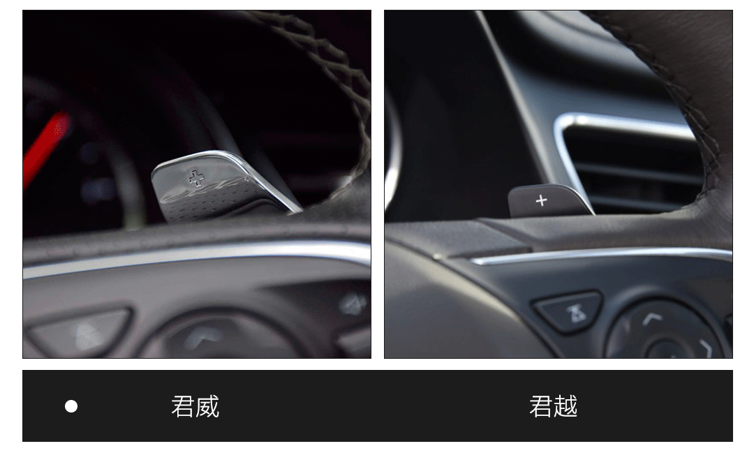 二者都配备了方向盘换挡拨片,但君威GS由于是运动定位,拨片使用几率更高,因此尺寸更大,而且还是亮银色,很有金属质感;君越的拨片就比较小了,毕竟定位上就是舒适性取向的豪华车,激烈驾驶的机会不多。