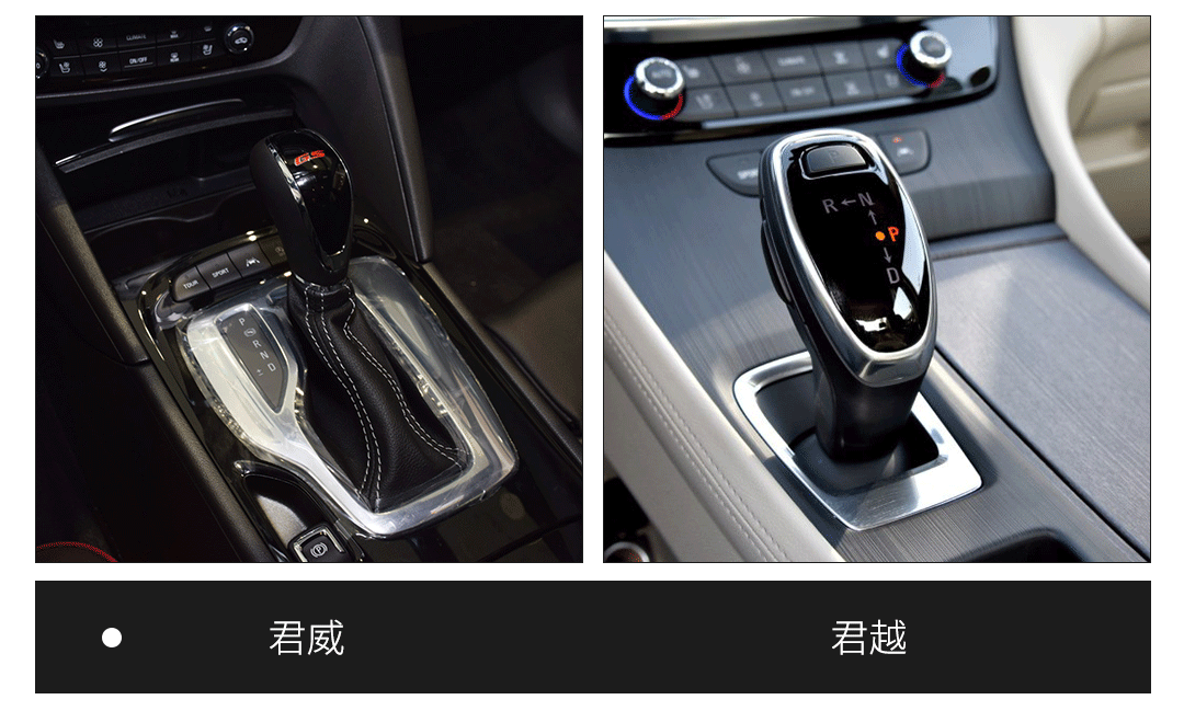君威依然采用传统的机械式挡把,而君越不仅是电子档把,而且在档位布局上也和别的车不一样,从传统的P-R-N-D布局变成了P档位于N档的D档之间,R档在N档左边的布局,优点是可以避免档位误操作挂入R档,提高安全性,缺点则是需要一定时间来适应。