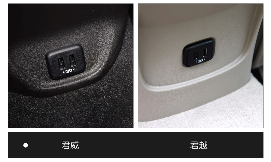 两款车后排都标配了空调出风口和两个USB充电插口,后排乘客不用抢着插口给手机充电了,值得表扬。