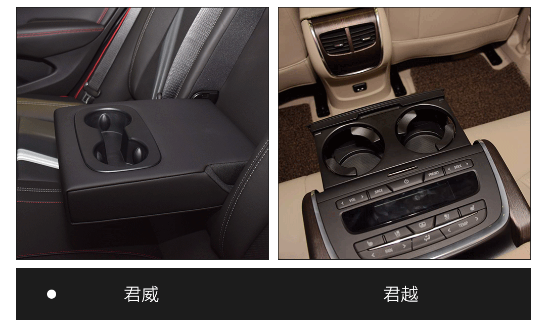 中央扶手则体现了两款车的定位差异,君威主要照顾前排的感受,因此即使是最高配的GS车型,后排中央扶手也只有两个杯架,要啥自行车?君越就不同了,经常要承担商务接待的任务,后排乘客的感受就很重要了,最高配的Avenir车型后排中央扶手有杯架不用说,还集成了空调、音响、座椅加热通风等控制功能。
