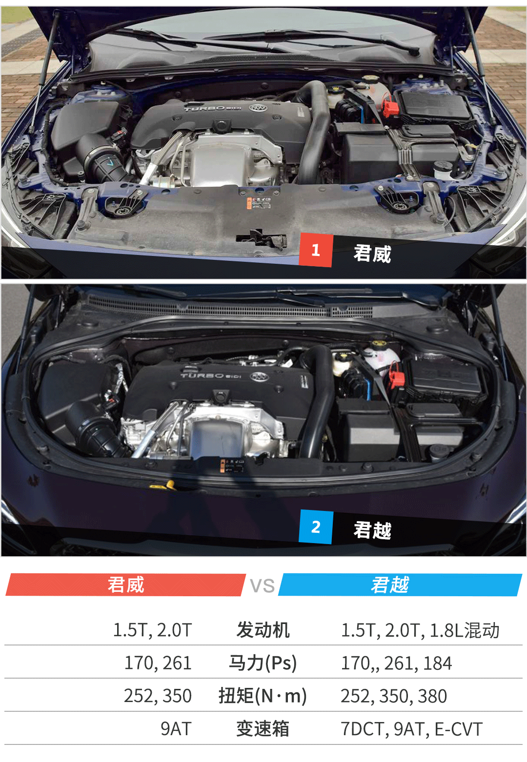 动力系统:同样价钱,君威能做鸡头,君越只能当凤尾(即将在2019年年初上市的新款君越将用1.3T三缸机替换1.5T四缸机)