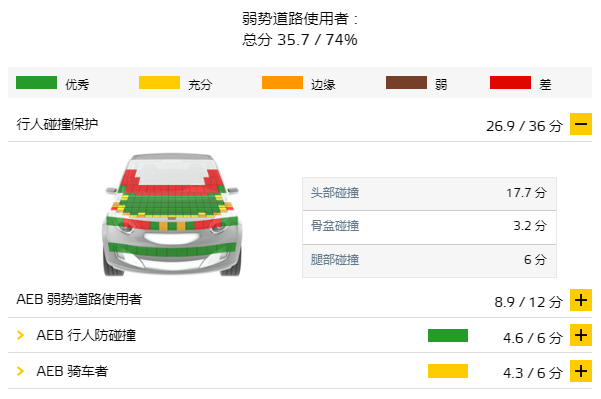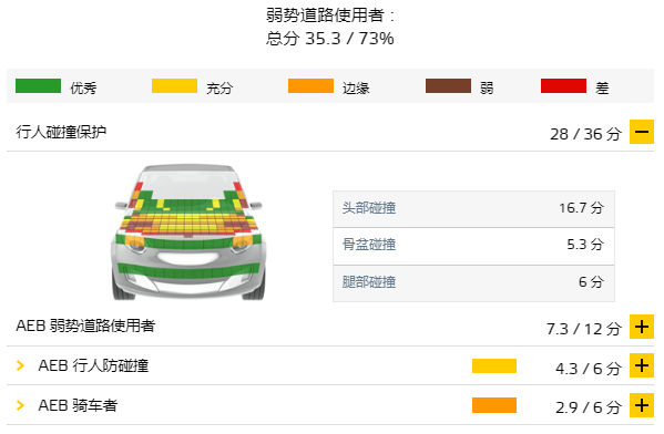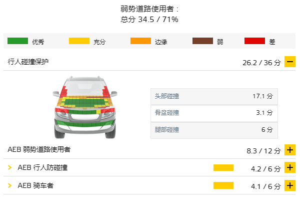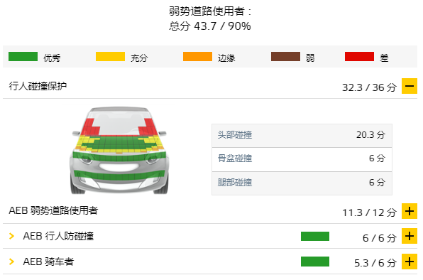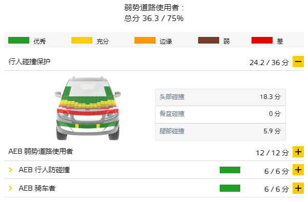 来到了行人保护板块,从结果可以看出,行人保护评定分为头部、骨盆以及腿部三个部分,宝马X5在行人头部以及腿部的保护都做得较为到位,唯独是对行人骨盆的保护十分差,得分为0,拖了后腿。