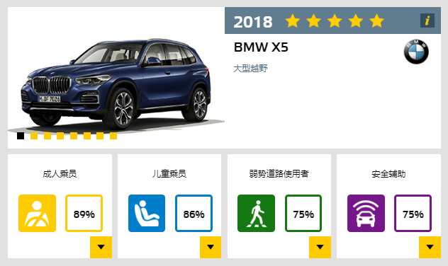 作为刚刚上市不久的全新车型,宝马X5不出所料地拿到了五星的好成绩,下面我们就看看宝马X5在各个测试部分的得分情况。