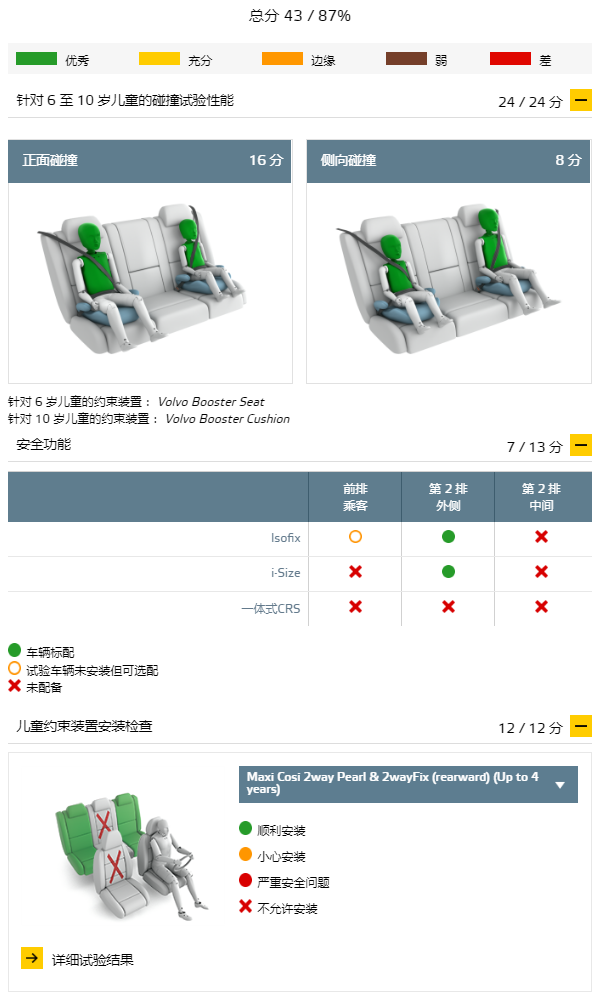 在儿童保护方面,XC40与S60一样,拿到了满分的成绩,并不意外,而在儿童座椅的可安装位置以及安装难以程度方面,XC40与S60并没有太大的区别,依旧是十分高的水准。