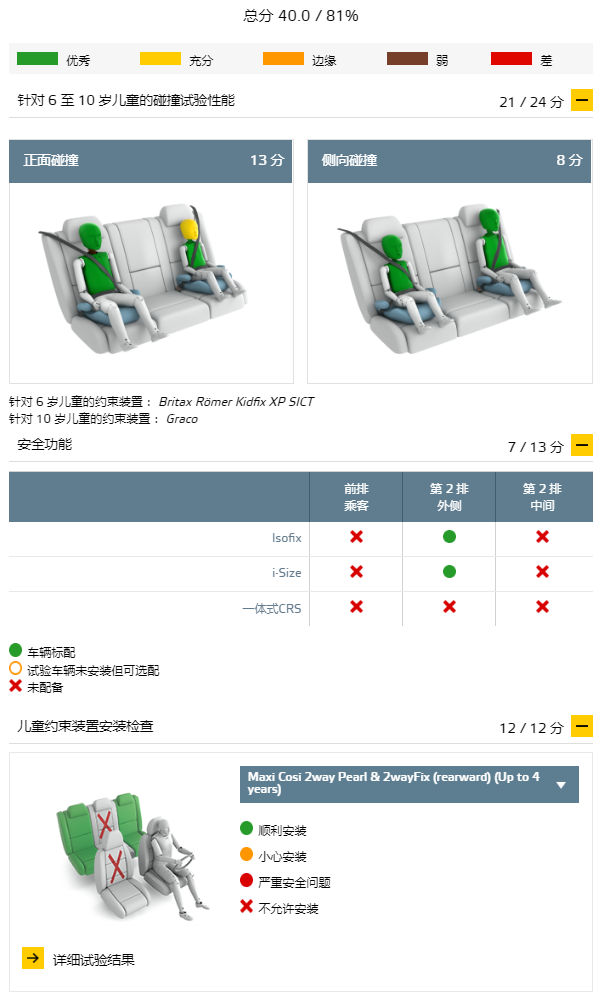 在儿童保护方面,I-PACE同样有待提高,在正面碰撞中,10儿童模型颈部受到的冲击力较大,因此在这部分E-NCAP给出了弱的评定,分数也被扣减。同时,儿童座椅仅能安放在后排两侧的座位,安装难以程度较低。