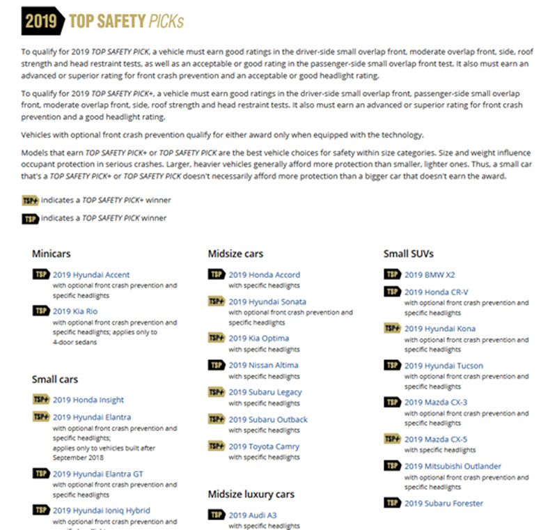 相比起国内的“五星批发部”,美国高速公路安全保险协会IIHS(Insurance Institute for Highway Safety)的碰撞测试结果要权威且靠谱得多,在业界也广受认可。在2019年来临之际,IIHS公布了最新一期的汽车安全榜单。