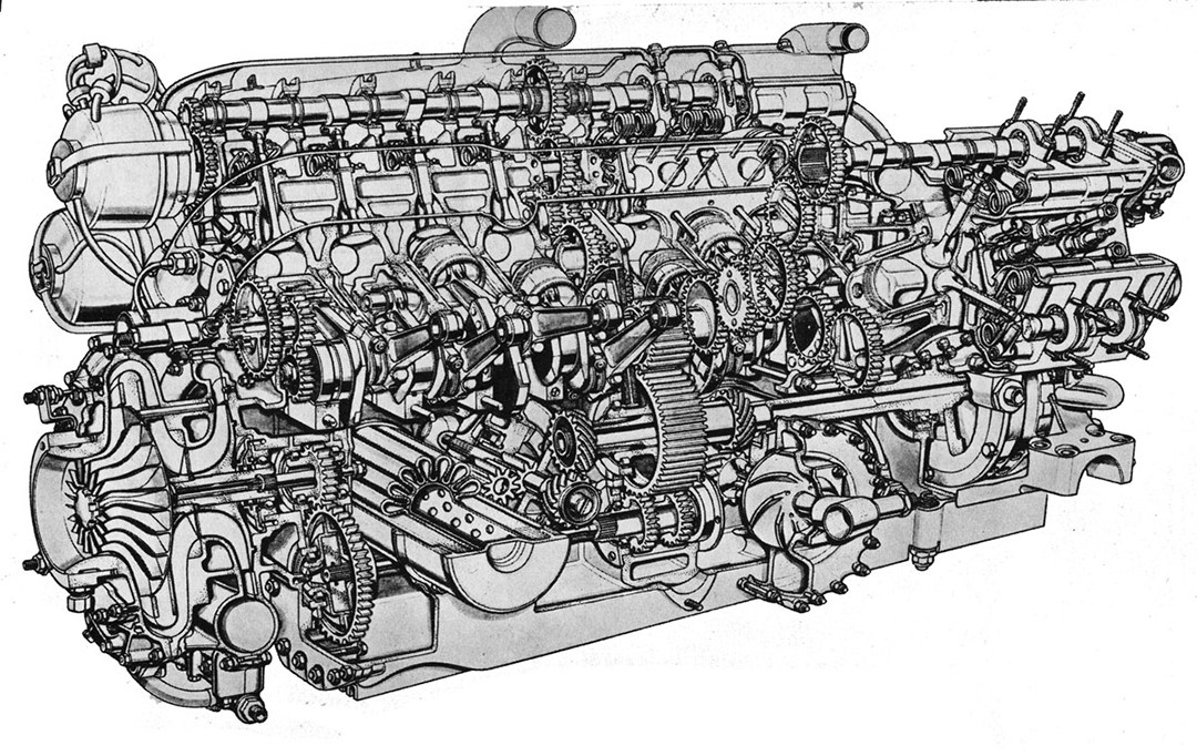 这副V16发动机基本概念是将两台750cc的V8引擎尾对尾结合在一起。和现在发动机的通用布局不同,它最奇特的地方在于,发动机飞轮和凸轮轴皮带轮都在安装在引擎的最中间。同时使用干油底壳设计,135度夹角。同时采用劳斯莱斯制造的两级离心式机械增压器。按照估算,其最大输出在12,000转时能输出600匹最大马力(最大增压值为5.7bar),而劳斯莱斯的测试结果是这台V16超高转速引擎可以将转速提升至14,000转。